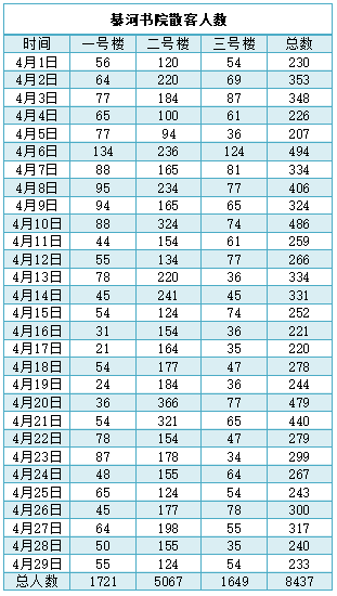 这个四月,綦河书院一、二、三号楼功能室总使用1077次,总使用时长为1170个小时,总使用人数达32033,散客数量8437人,平均每天使用约1347人次。总体数据使用情况有所上升,四月的书院依旧精彩。