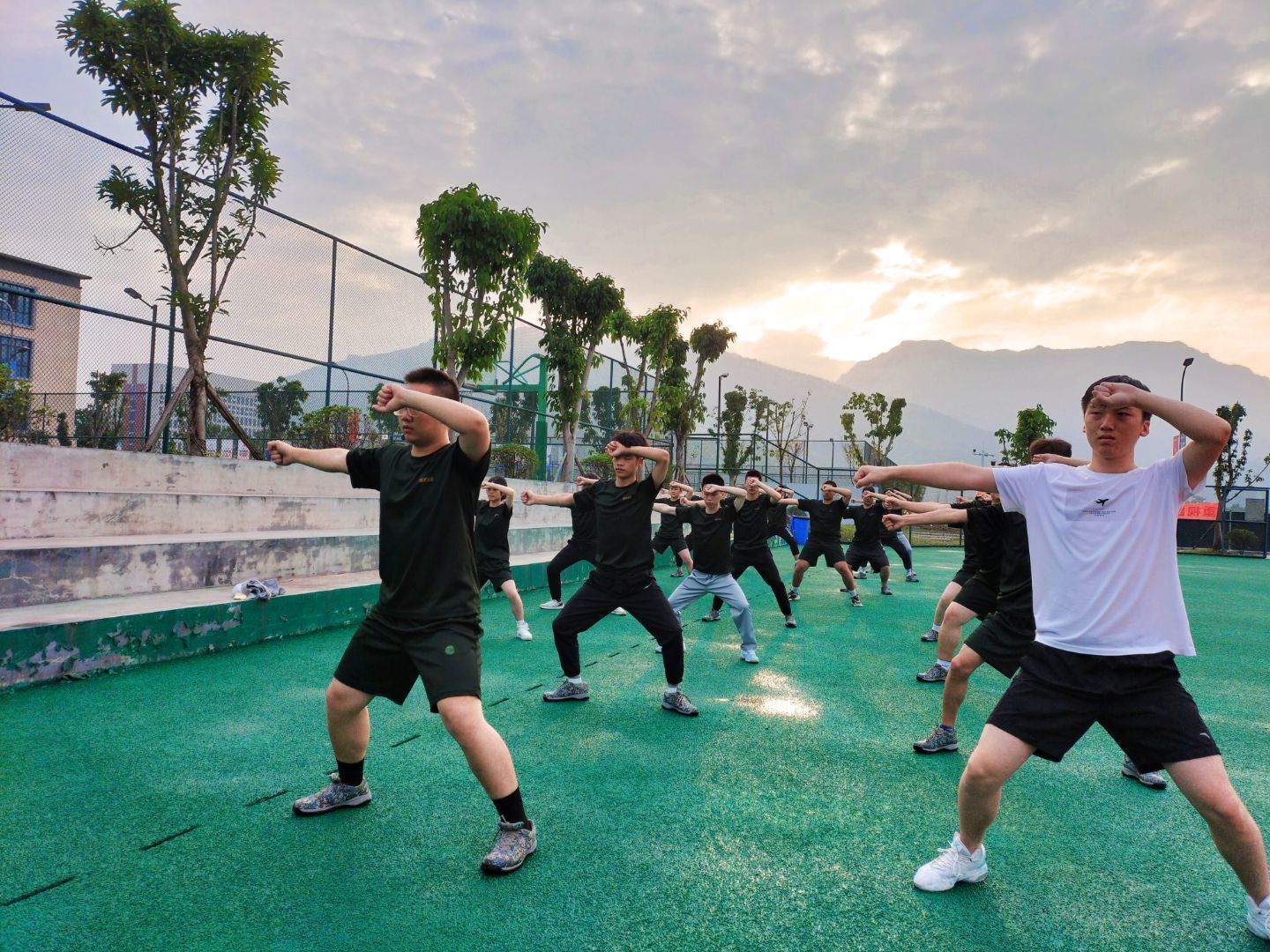 晚风吹来,夕阳落在我们的身上,来到最后一个训练科目。擒敌拳作为迷彩俱乐部的必训内容之一,每次训练都以它为结束。擒敌拳是一种以击打技术、防击技术和擒拿技术为主的综合练习,是武警部队的必须科目。经常练习擒敌拳可以熟练功作要领,锻炼身体的协调性和灵活性,增强攻防击打的能力。打擒敌拳对队员们的力量、耐力、速度有提升作用,同时培养青少年强韧不拔、勇敢顽强的作风。这项训练不仅是个人提升,更是团队磨合。刚开始时队员们互不相识,在一次一次的训练中,一次一次的磨合下,一次一次的配合下,队员的整体素质、集体意识得到提升。