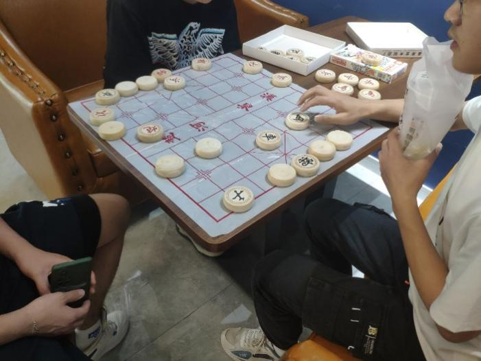 揭棋战场因为有了暗棋子力的介入,为最终的棋局输赢增添了很大的的不确定因素,但运气不代表一切,不坚持到最后,怎见得胜败。有同学先手方运气很好,占尽优势和先机,步步将军做杀棋,直指对方九宫的大将,后手方节节败退,眼看就要被“绝杀”,但可能是后手方同学的坚持得到了认可,在紧要时刻新翻出来暗棋化解了攻势,甚至使整个棋局发生了大变转。最后,这局棋后手方拿下了胜利。红黑双方喜笑颜开,整个咖啡厅洋溢着快乐的笑声,是惜败后的释怀,是侥胜后的喜悦。