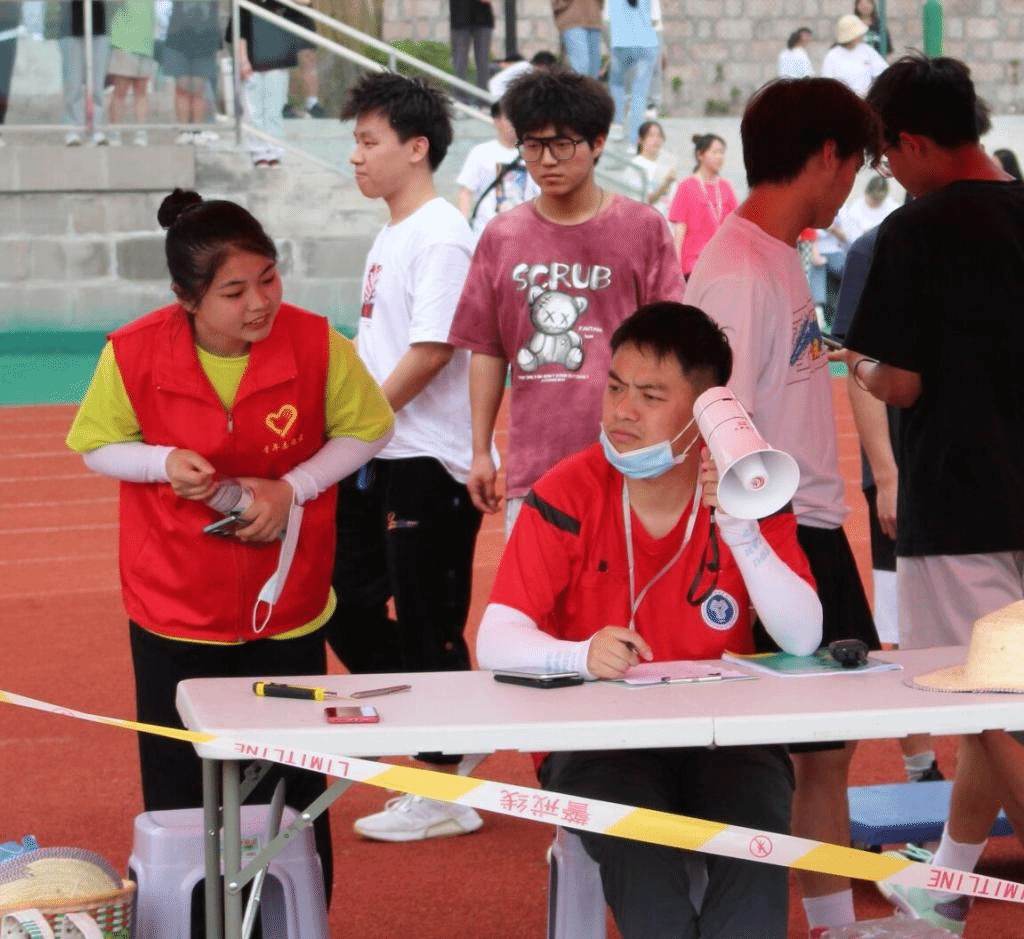 机械的正常运行,离不开每一个细小齿轮的转动。有这样一群红色的身影,他们在最早的时候到达,却在最晚的时候离开,穿梭在操场的各个角落,为确保运动会正常进行,在各自的岗位默默工作着。他们或是在门口提醒同学入场时出示双码;或是在观众台下,维持现场的秩序;或是在入口处,引导运动员顺利入场,也或是辅助裁判进行现场的数据记录……此次运动会为期2天,志愿服务个人总时长最高可达12个小时,炎炎烈日也依旧阻挡不了志愿热情。