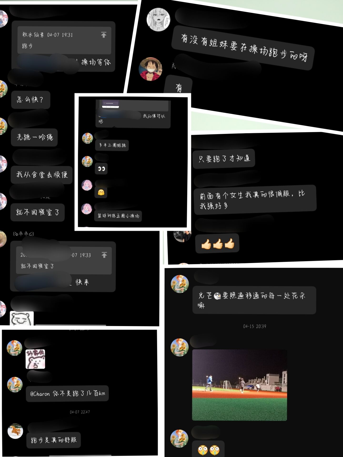荷花虽好,也要绿叶扶持,一个篱笆打三个桩,一个好汉要有三个帮。同学们渐渐发现一个人跑也许没有动力,但一群人跑就会相互监督,更容易坚持下来。群里常常会有组队结伴的同学:“今天有人要一起去跑步吗”,总是会得到热烈的回应。在跑步中找到志同道合的朋友,构建兴趣圈层,何乐而不为呢?