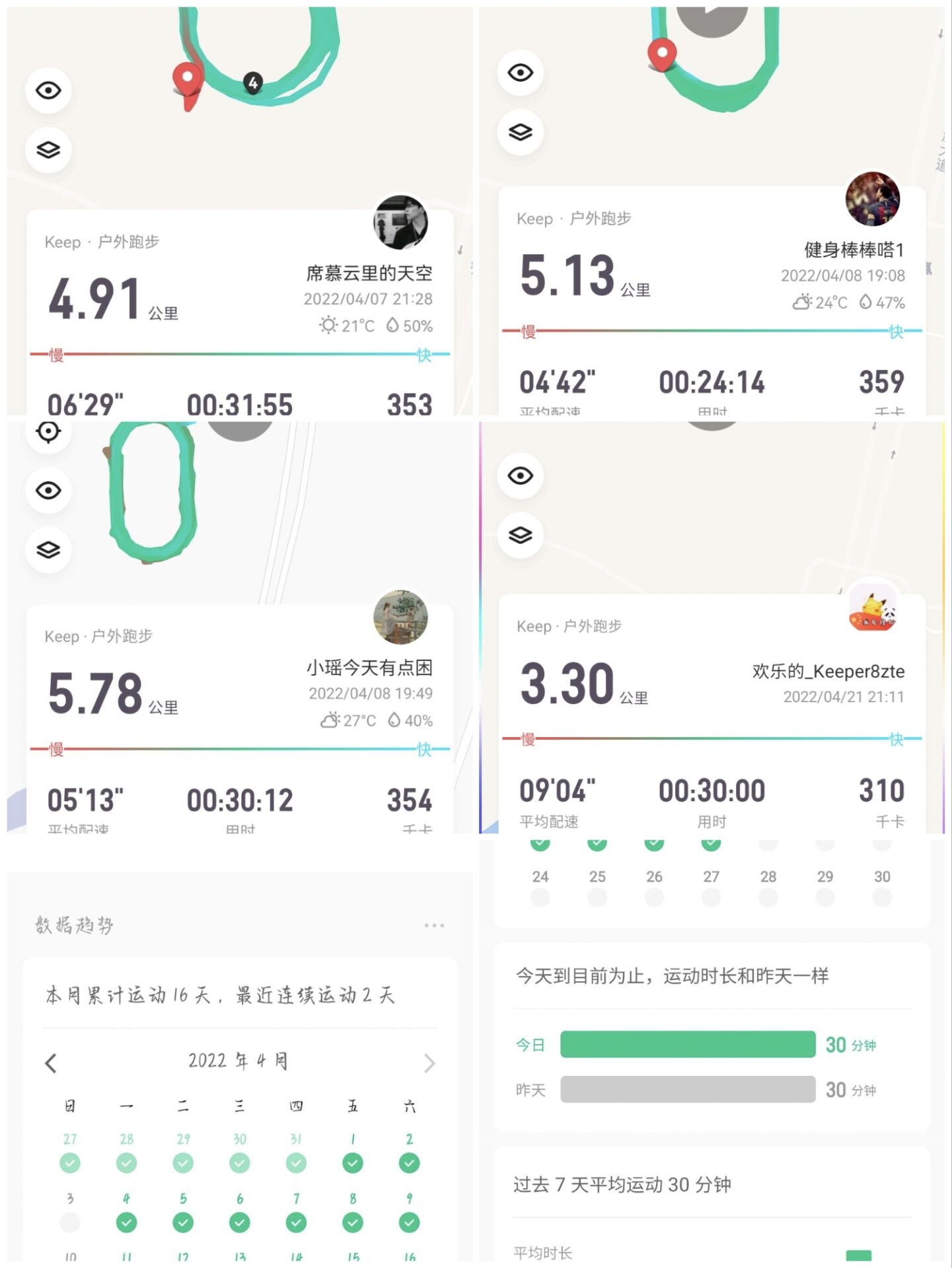 “从最开始的每天半小时不足5公里到后面每天一个多小时十几公里,我不再为了完成任务而跑,我为自己而跑。每次长跑过后,大汗淋漓的感觉让我觉得很舒服,跑完后的压腿放松过程也很是享受。我觉得跑步就像生活一样,就算会遇到困难,也不要轻易的放弃。只要我们坚持不懈,持之以恒地每天将跑步进行下去,将会越来越健康,越来越快乐。”