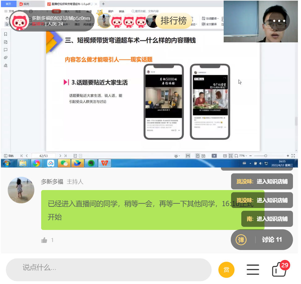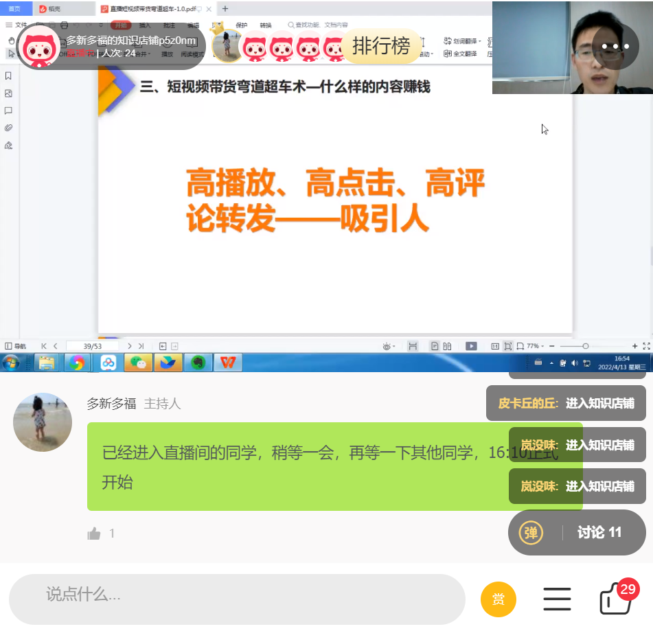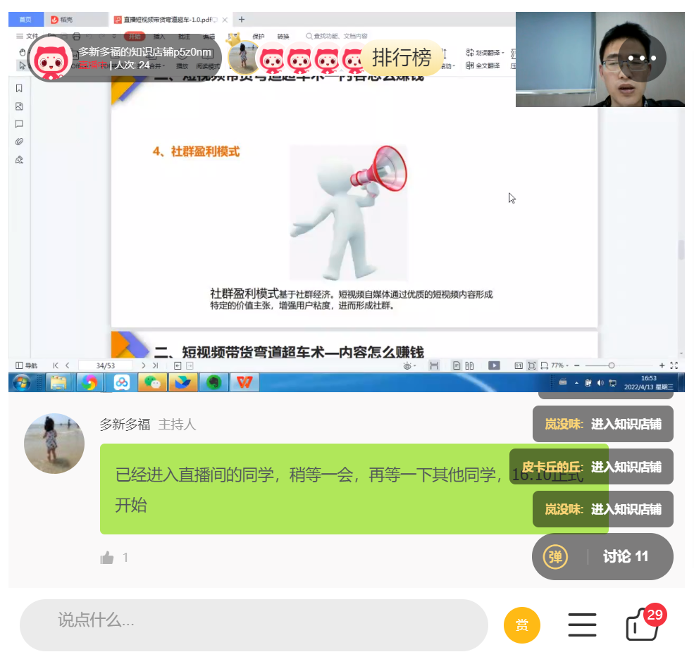 首先,李总对自己的任职经历做了一下简单的介绍。然后从直播短视频行业趋势解读、直播带货弯道超车术、短视频带货弯道超车术、农特产品怎么做直播带货等几个方面为大家做了详细的解读。在最后的互动交流环节,聚焦于专业学习相关问题,同学们积极踊跃在讨论区提问,李总结合自己多年的营销工作经验一一做出了回答,可谓干货满满,同学、老师都受益良多。