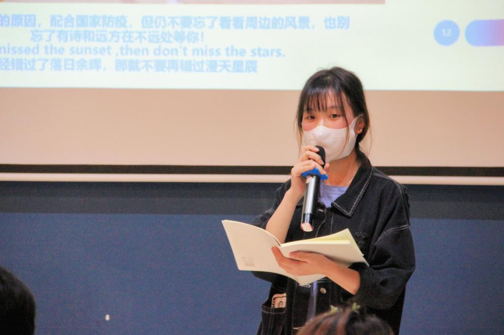 当同学们的分享结束,早就按捺不住的老师开始了他们的分享。杜嘉老师一面回忆2020年的海南之行,一面向往着2022年的重庆之旅。和她一样的,还有卓嘉老师,他说:“我们走遍四海八荒终归是要回到家乡的。”而尹欣老师思绪已经飘向了远方的故宫和西藏,迫不及待地想来一场说走就走的旅行。在分享的最后,杜荧老师告诉我们:“不管我们是去哪旅行,请不要弄丢了一直陪着你的人。”纵使行程万里,一回首,人间阳光正好,风过林稍,而我们还没散去。