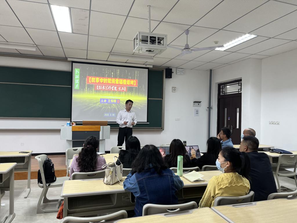 为了进一步提高教学和科研水平,营造良好的学术气氛,创意写作学院于3月30日下午在仁者楼309举办了教师系列学术讲座的第二场——由王恒绩老师主讲《故事中双线索碰撞结构的深层次美感》,创意写作学院全体教师参加了本次活动。