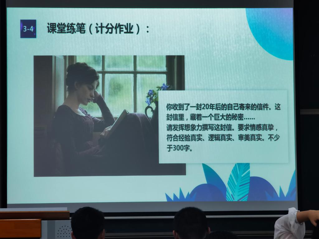 夏曦老师又带着同学们一起分享了大量文本中故事的合理性与不合理性,从中找到文学和文字的美感。课堂即将结束时,夏老师公布了本期作业:“你收到了一封20年后的自己寄来的信件,这封信里藏着一个巨大的秘密……”,要求同学们发挥想象力,下笔情感真挚,符合经验真实,逻辑真实和审美真实。同学们“哇”声一片。