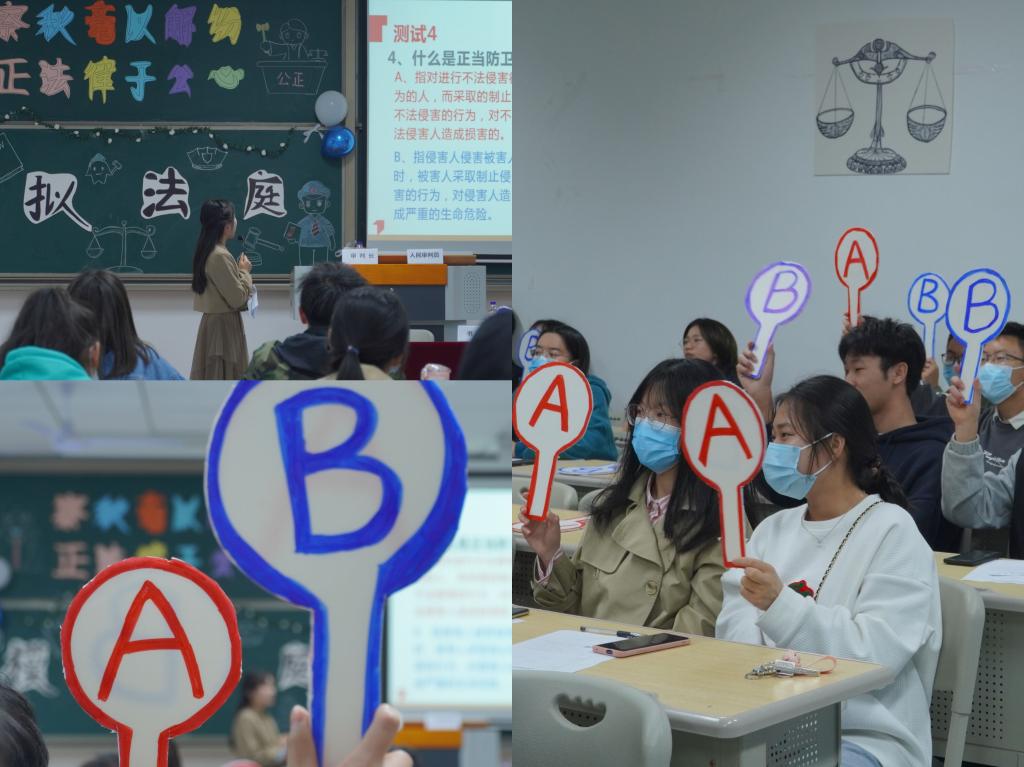 情景剧的尾声“刘正致”主动投案自首,一个模拟法庭就此拉开帷幕,模拟法庭通过法庭准备阶段、法庭调查阶段、法庭取证阶段、法庭辩论阶段等四个阶段的庭审展示,向同学们生动地普及了法律知识。庭审中的“公诉人”与“刘正致的辩护人”就“刘正致”是否故意刺杀被害人展开了激烈的辩论。更是将全场的浓重氛围引向了高潮。在辩论环节,演员们的精彩表演,使得旁观的同学忍不住喝彩。模拟法庭不仅让同学们更清晰直观的了解了法庭审理案件的流程和细节,还培养和锻炼了同学们关于发现问题、分析问题和解决问题的能力。这次模拟法庭,同学们也认识到,作为学生,学法、懂法、知法、守法的必要性,同时每个人都应该尽己所能,自觉维护法律的权威!