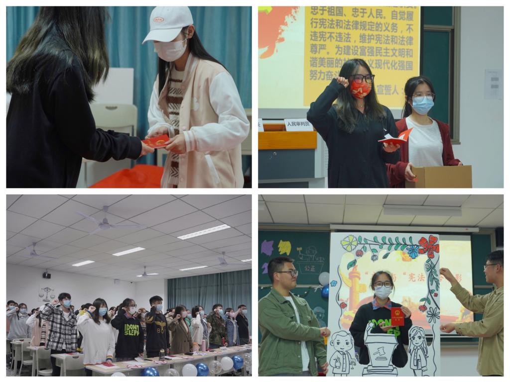 宪法,乃国之根本,民之倚仗。学习宪法,就是要弘扬宪法精神,增强宪法观念,培养宪法意识,普及宪法知识,塑造宪法文化,使宪法更加贴近我们生活,成为生活中的规则与习惯。为加深宪法在同学们心中的印记,年级会特意为同学们播放《美好生活,始于宪法》的视频,希望能让宪法之光照亮普法之路。随后,年级会为同学们颁发了精心准备的《宪法》,同学们庄重的手捧《宪法》,并在刘雨洁同学的带领下一同庄严宣誓。从这一刻起,手中薄薄的《宪法》在同学们心中也变得沉重起来。宣誓过后,同学们还与宪法进行了自由的合影。《宪法》,就是一张写着人民权利的纸。在法治社会中,学习宪法不是一时的,而是一世的,希望同学们能够牢牢紧握《宪法》这个法律武器,把它放在自己的人生行囊里,再出发!