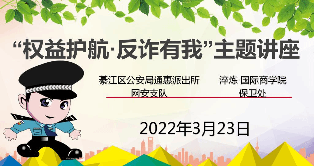 为进一步普及防诈骗知识,筑牢电信网络新型违法犯罪防火墙,提高全院师生的反诈意识,淬炼·国际商学院(綦江校区)联合綦江区公安局通惠派出所、綦江区公安局网安支队、学校保卫处,在2022年3月23日下午通过线上和线下相结合形式开展了“权益护航·反诈有我”主题宣讲活动。
