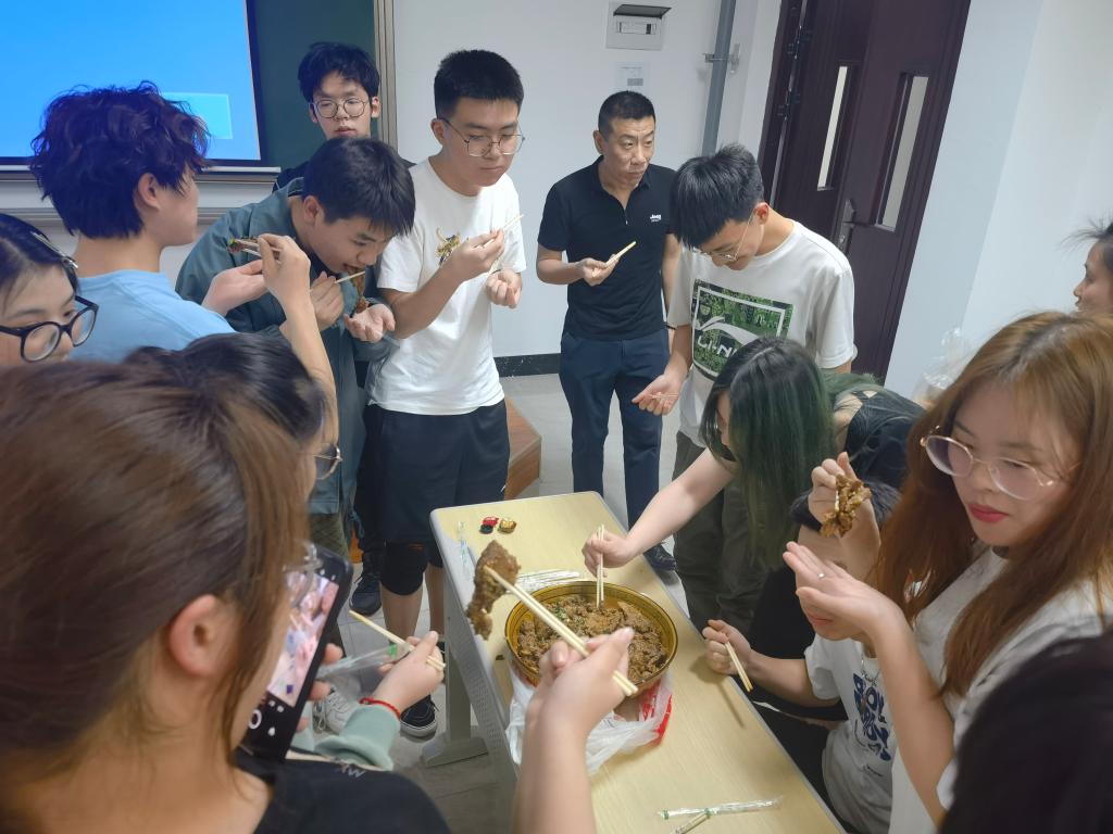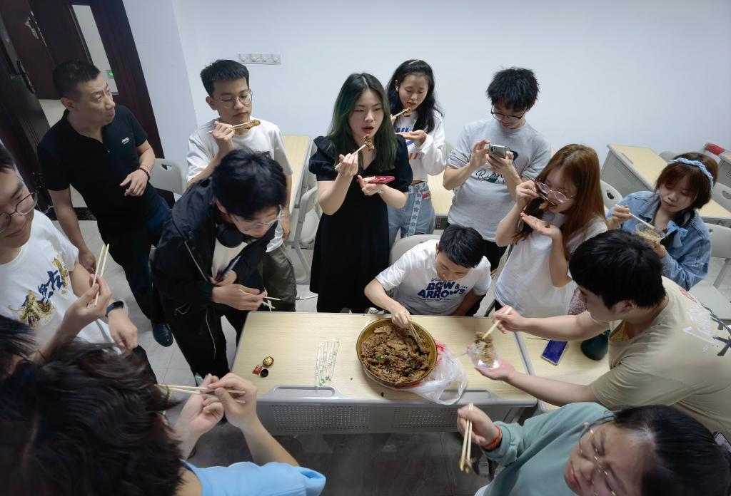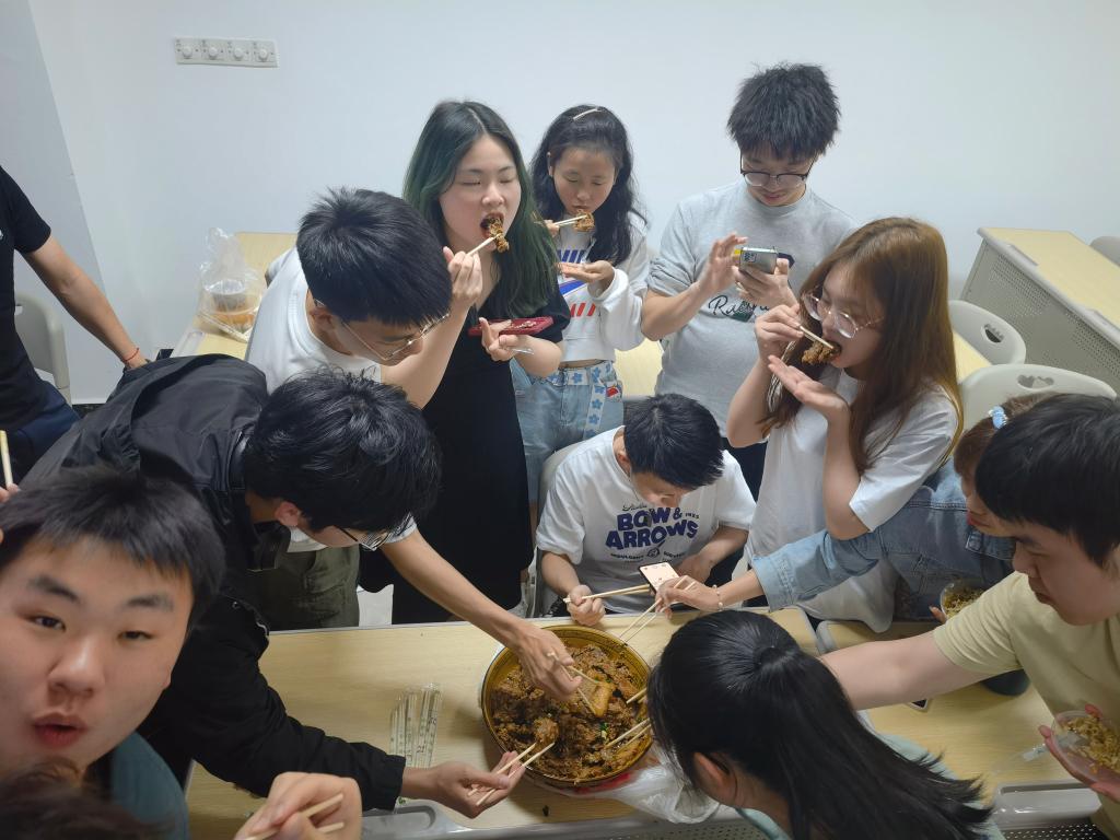 面对如此美食,所有同学围过来,吃完李慧文老师带来的巧克力,又拿起筷子分食粉蒸肉,要减肥的女生也顾不得斯文,说吃饱了才有力气减肥,就连隔壁班的老师也闻着香味过来分一杯羹,场面太欢乐了。
