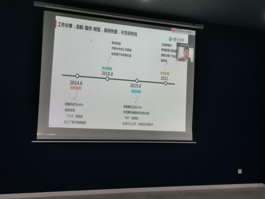 随后校友黄小枫分享了自己工作的经历,从游戏至产品的蜕变转型,讲述了如今互联网大环境,工作时出现的问题,对如何就业,怎样进入腾讯等大厂等问题提出了自己的见解,并希望帮助同学们更方便的找到自己适合的职位,如果符合条件,会积极帮助同学们投递简历。大家对这个福利都兴奋不已,同时看到腾讯工作环境的优异,都对未来充满了向往。