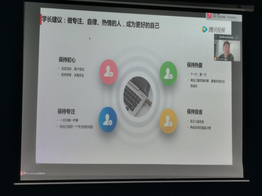 杜嘉老师邀请黄小枫校友远程连线,为大家讲述他自己大学时的经历以及工作的时间线,黄小枫充实、优秀的大学生活以及丰富的互联网大厂工作经验,让同学们开阔了眼界,同时他建议我们在大学时期要多参加竞赛,提升自己,无论是选择考研还是就业,都应该向着自己选择的目标努力奋斗。