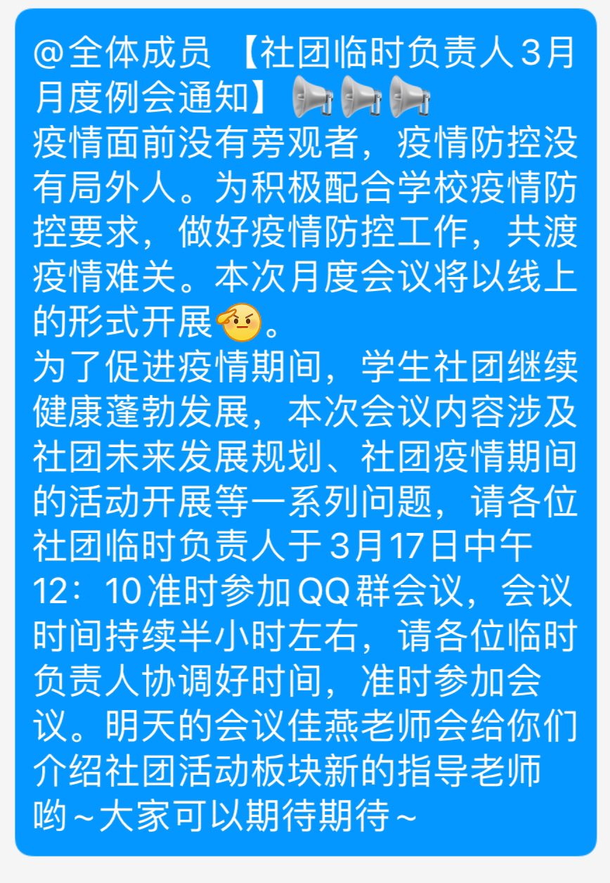 在指导老师会议之前,由于疫情防控的要求,对于社团临时负责人这一庞大的群体,社团服务部采用线上会议形式开展,本次会议团委杨佳燕老师首先提出了在防疫阶段如何开展社团活动的建议,并在此后通过社团常规管理、负责人选聘、社团活动安全、社团宣传等方面提出了要求与希望。虽然疫情隔绝了距离,但我们始终相信,社团的热情不会被笼罩在这一严峻的形势之下,在做好防护的前提,我们依旧会给同学们带来更多、更好的社团精彩。