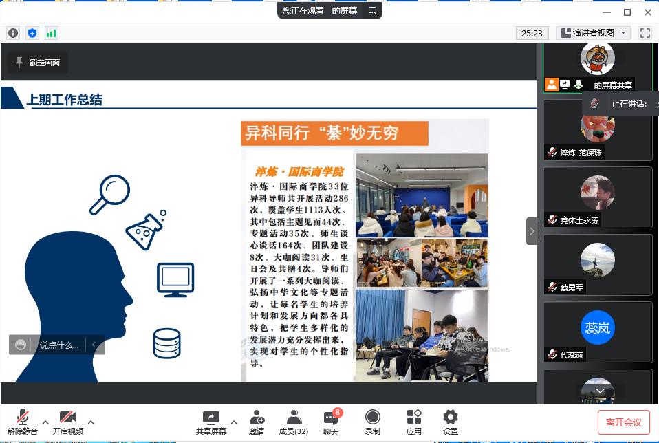 为阶段性的总结工作经验和方法,深化异科导师的工作成效,本次会议对上学期的异科导师工作进行复盘,以及本学期工作的开展制定了相关计划,为异科导师工作的提质焕新促进打下坚实的基础。