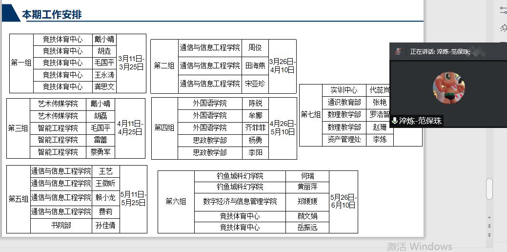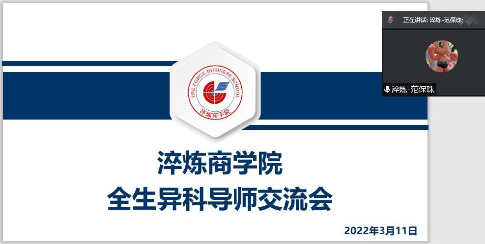为了从知心朋友、成长伙伴、人生导师三个角度全方位给綦江校区淬炼商学院的学生们带来个性化指导,贴近生活,更好地帮助并见证学生们的成长,3月11日中午12:30,范保珠副院长、异科导师负责人周晓蝶老师组织了来自合川、綦江不同院系、部门的导师们,通过线上会议的方式对异科导师的工作进行了交流和沟通。