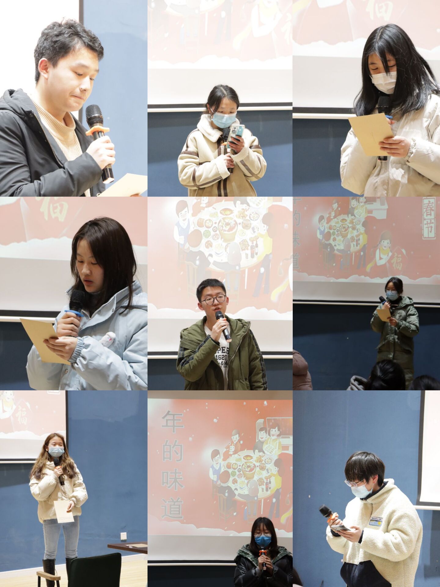 活动现场,同学们踊跃分享自己的寒假趣事,有的同学寒假四处游乐,市内网红打卡一地不落;有的同学新春年味满满,压岁贴福、烟花爆竹好不热闹;有的同学静心养神、大咖伴读,在祥和的日子里寻找内心深处的平静;还有些同学,在步入大学的第一个假期里,与曾经同窗多年的伙伴们再次相聚,分享彼此的趣闻见地。
