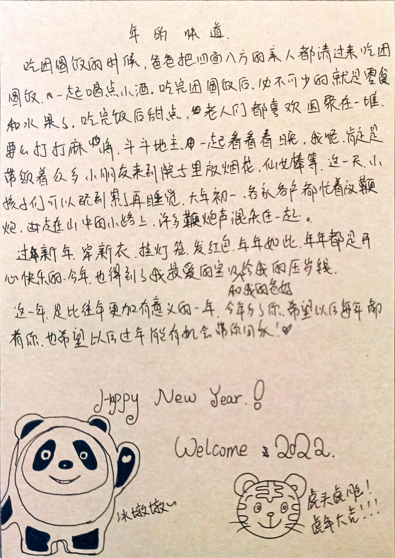 我们老家的特别习俗——灌糯米肠。顾名思义,就是用糯米灌的肠子。灌糯米肠是个细活,工艺特别讲究,稍一马虎就坏了。如果糯米太多了,就会像炸弹一样,煮的时候会炸掉,太少了也不好,吃起来不香。做好的糯米肠,像泥鳅一样非常滑,仿佛要从我手中逃脱一样。当然啦,除此之外还有一个最重大的习俗——吃年夜饭。一碗一碗香喷喷的饭菜从厨房中端了出来,有绿油油的青菜,犹如一块块绿翡翠,还有金亮亮的大黄鱼,在灯光的照耀下,像一块金子似的闪闪发光,最重要的必须还要有年糕,它有着年年“糕”(高)的含义……虎年的这顿年夜饭,是我吃的最干净、最心满意足的一次,令人难以忘怀。