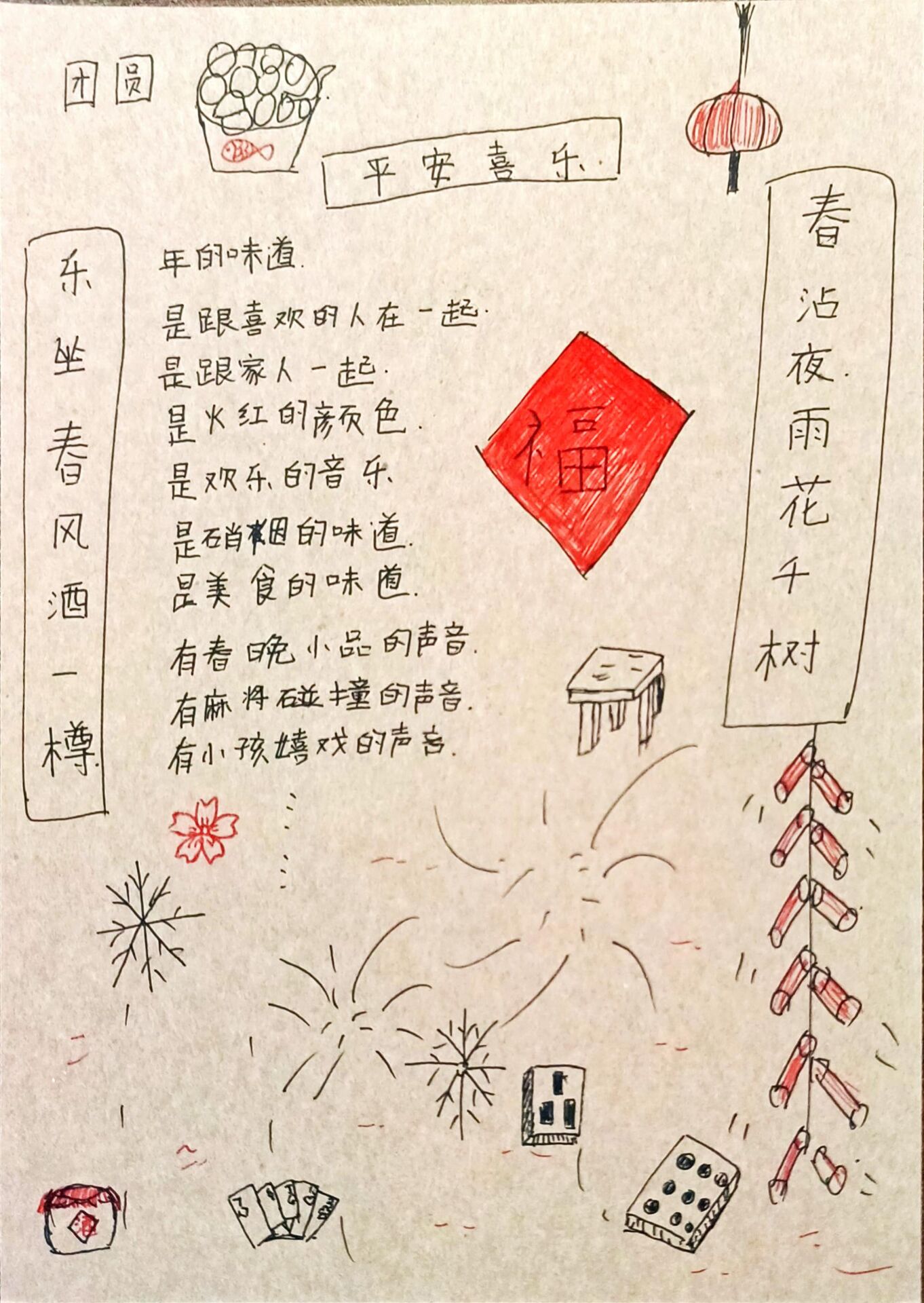 过年的时候还有守岁、燃放爆竹、拜年、给压岁钱等各种习俗。茶馆中,同学们尽情地分享着属于各自的专属年味: