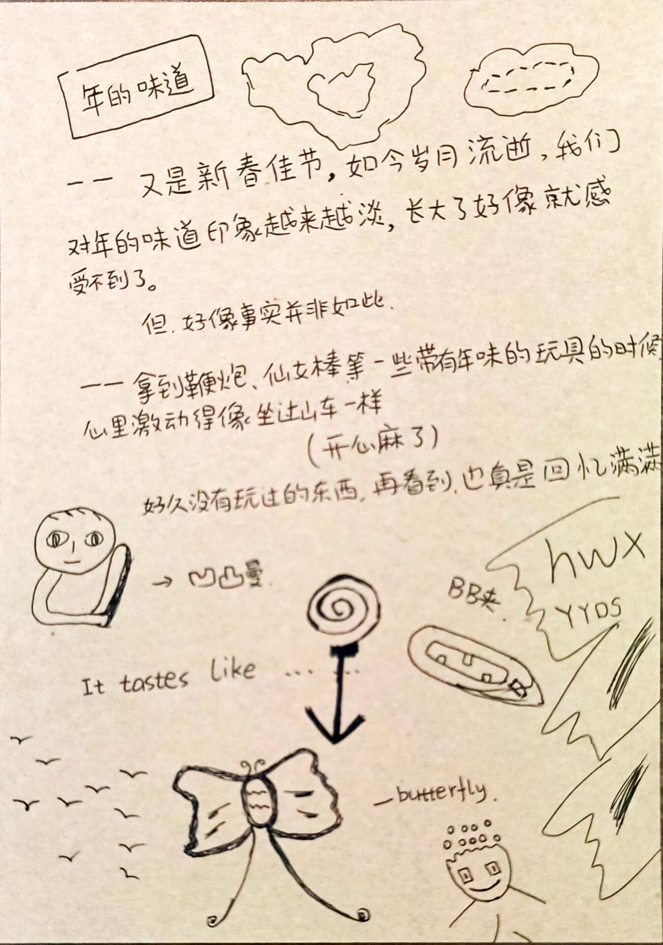 “我的年味是甜的。一家人围坐在一起看春晚,在零点和家人护送第一声祝福,清晨起床吃汤圆,甜甜的汤圆甜甜的年。”