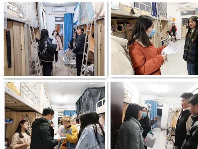 晚上九点,各位辅导员老师均带着辅导员助理前往各楼栋寝室开启新学期的第一次学院大走寝。此次联合大查寝,老师们带着辅导员助理一个寝室一个寝室的走访,核实各班级学生到校报道情况,进行疫情健康排查;同时,也通过走寝与同学们畅聊寒假生活的点点滴滴,了解同学们的问题与所需,宣传安全知识与疫情防控政策,提醒同学们防范网络诈骗、理性消费以及注意用电安全等;最后,老师还叮嘱同学们在新学期要尽快收心,做好新学期规划,努力使自己变的更好。