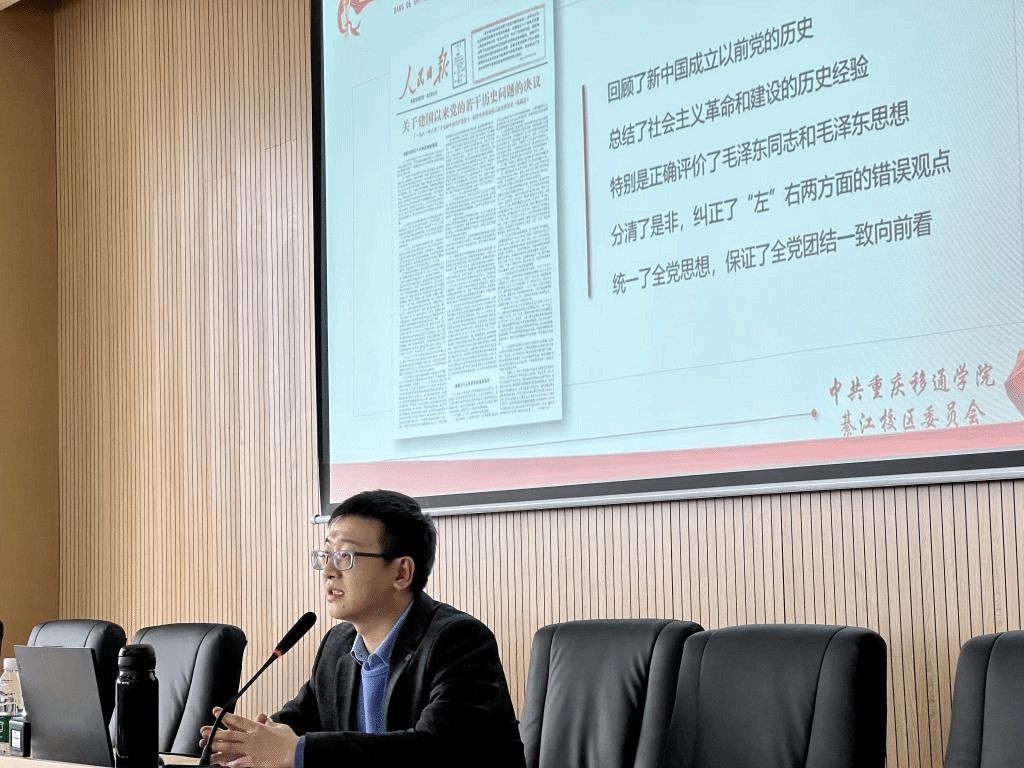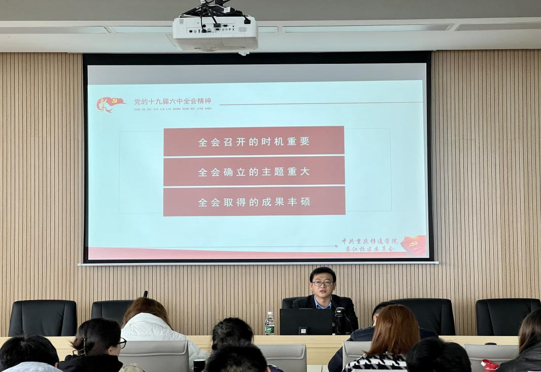 为在綦江校区迅速掀起学习宣传贯彻党的十九届六中全会精神的热潮,我校采用党建带团建的方式,在重庆移通学院党委的引领示范下,团委紧接齐力对六中全会精神进行宣传学习,全面准确阐释好、解读好全会精神,提高思想站位。在2021年12月24日和2022年1月7日,重庆移通学院綦江校区开展了党的十九届六中全会精神“进校园”专题宣讲会,分别是学校党委委员、副校长,綦江校区党委副书记、管委会副主任李文豹和綦江校区团委副书记蔡星宇作为主讲人,面向完满教育系统各职能部门老师和校级学生组织骨干代表开展专题宣讲会。