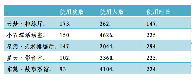 其中使用频次最高的五间功能室为云梦·排练厅、小石潭活动室、星河艺术排练厅等。