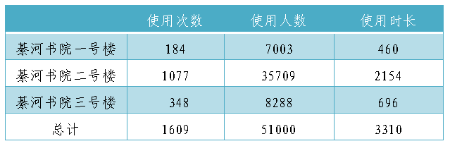 在12月,綦河书院一、二、三号楼功能室总使用1609次,时长为3310小时,人数为51000人。綦河书院平均每天有1645人使用功能室,每个功能室平均每天使用5小时,总使用106小时。