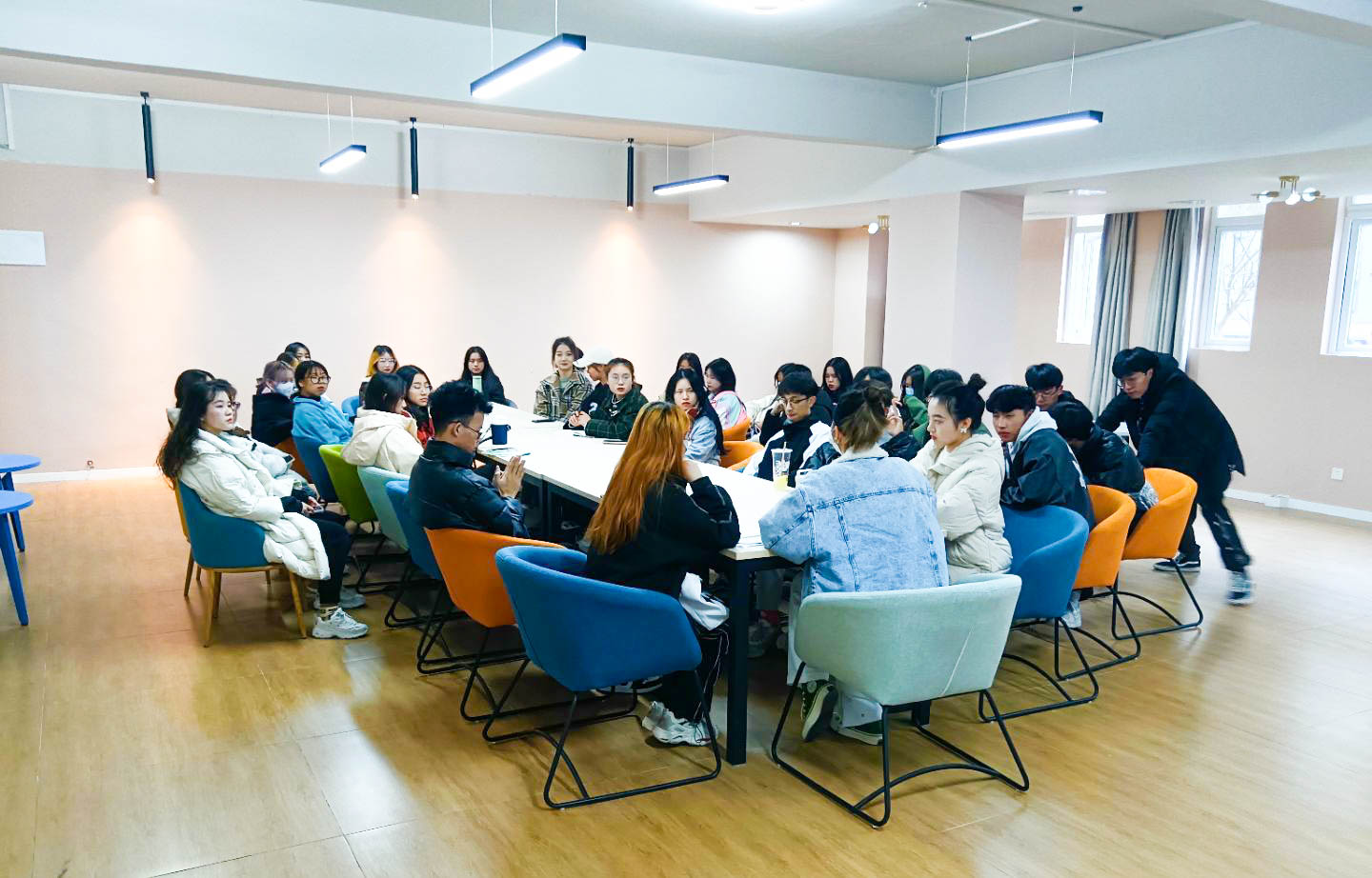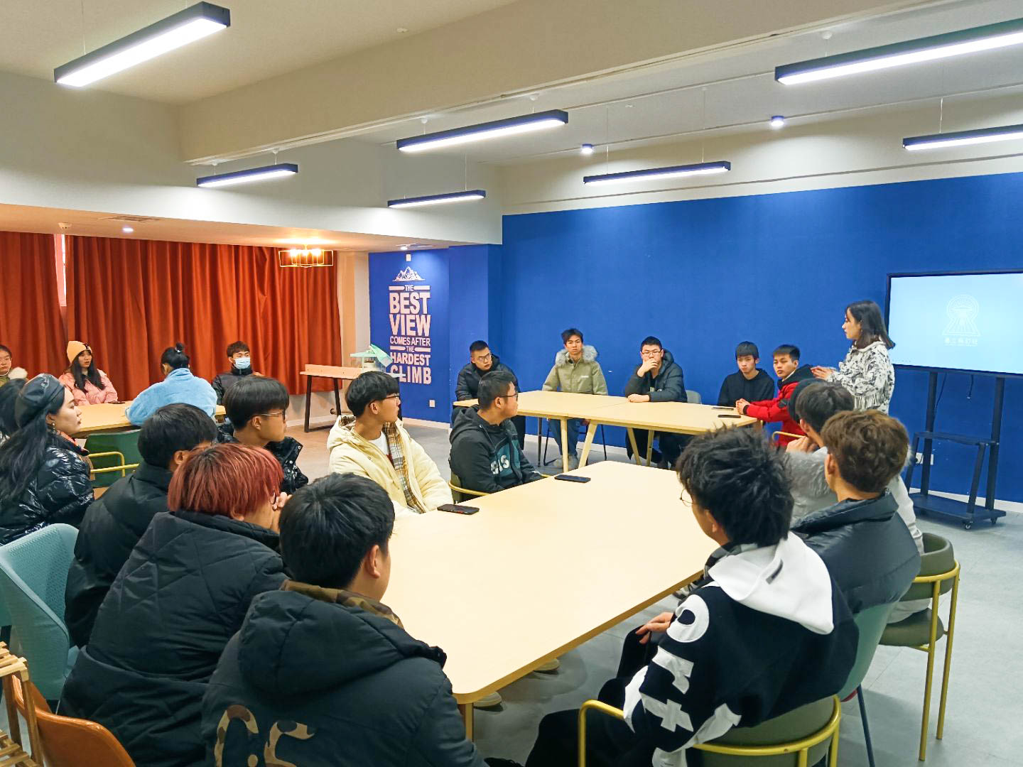 13日在千山会议室和兰芷交流空间内,同学们在这里开展部门例会,总结不足和部署工作。