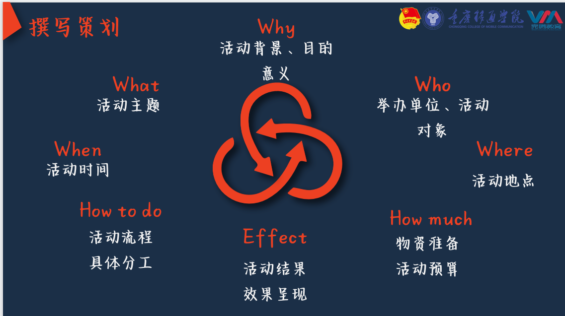 一个好的策划最主要的就是其内容,所以第二板块,杨老师以撰写策划为板块内容。教同学们如何去写好一篇策划书,包括撰写策划的基本原则以及策划的内容涵盖、目的意义等,通过五个W、两个H、一个E分别细说,清晰明了,让同学们能在其中有所收获。