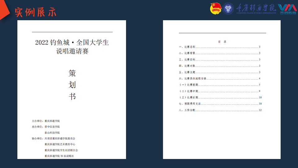 最后一个板块就是实例展示,在社团做过的活动中,杨老师选择了一份已经成熟了的策划案,给同学们做案例分析,同学们充满了学习的兴趣,这份说唱邀请赛的策划书涉及了活动所会经历的所有流程,它生动又直观的给同学们做了展示以及还有一些成功举办的活动的现场图也让同学们知道一份成熟的策划就会是一个活动成功举办的基础。