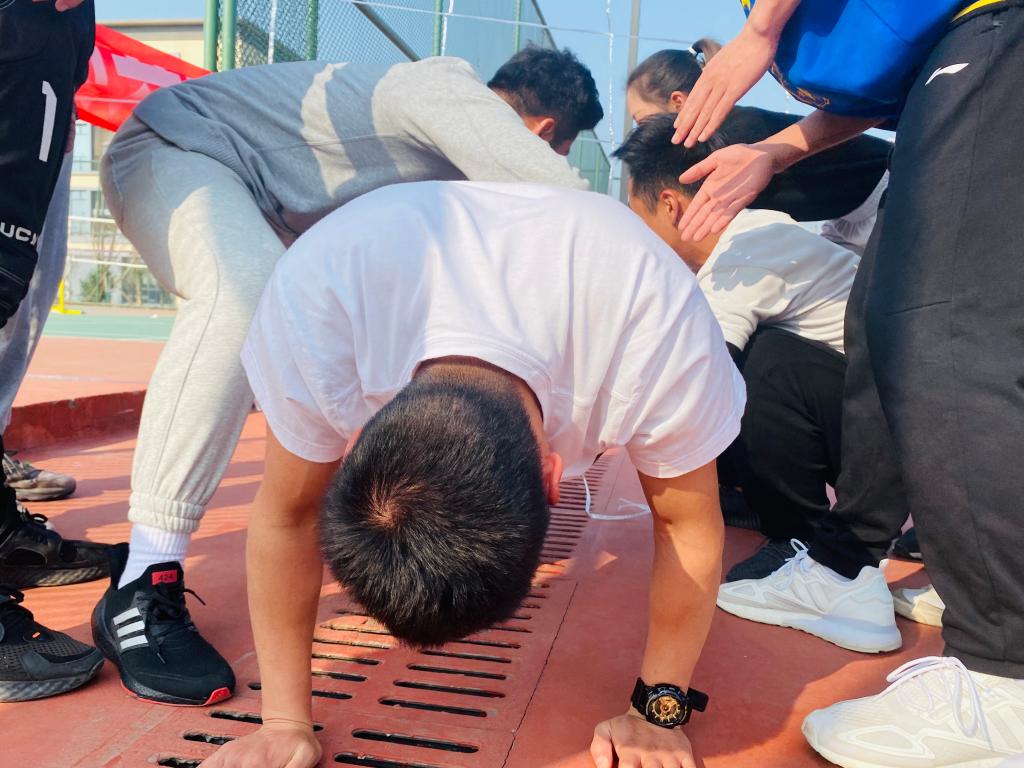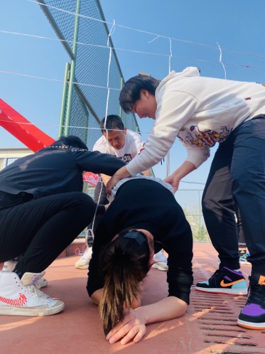课程中,王碧铄老师用幽默的语言铺垫了故事,为大家详细的讲述了项目规则,要求全部队员在30分钟以内,从网的一边穿越到另外一边,并且一个网只能用一次,身体任意部位不能触网,若超时则挑战失败。在了解完具体内容后,各位老师确立方案,明确分工,有效的进行组织协调。在挑战开始前,给了老师们5分钟的时间热身以及讨论时间。第一上场尝试的是曹静老师,采用了“脚-身-头”的顺序通过,比比划划,终于在几位老师的齐心协力之下成功通过电网,为我们开了一个好彩头。要知道活动进行过程中不是每个人通过都很顺利,也会触网,会“阵亡”,但是面对困难时,老师们没有灰心,鼓起士气团结合作,用一次次尝试让所有人通过电网。