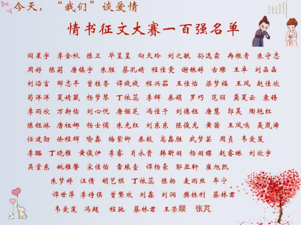 这场盛大火爆的征文活动在众人期待之下,于11月30日截稿。12月10日下午,优质情书评选工作结束,听到情书征文100强的名单出炉,即将公布的消息,同学们激动不已,欢呼庆祝。