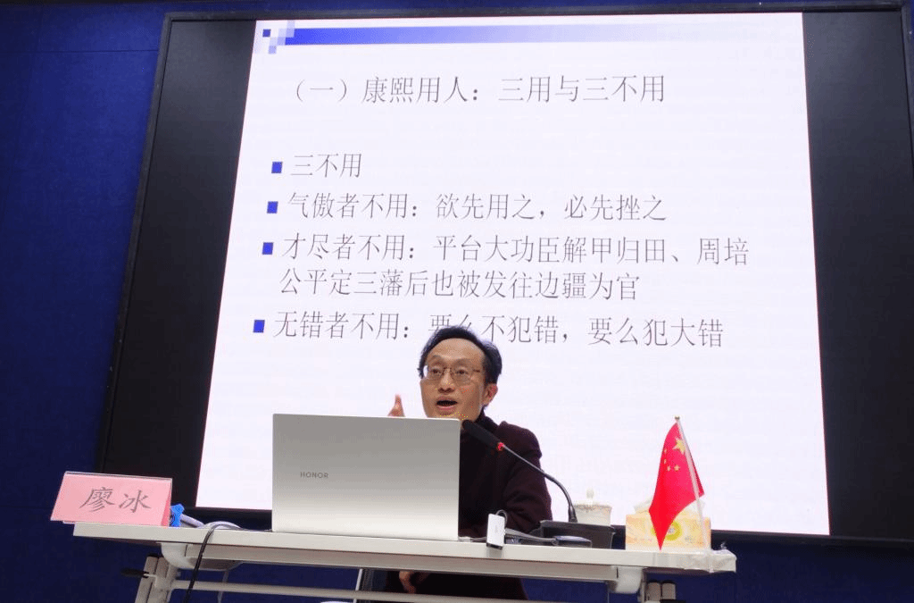 廖冰教授通过讲故事的形式拉开讲座的序幕。首先他向同学们讲述了康熙皇帝通过同时提拔明珠和索额图两人,使得双方相互制约,从而达到国家治理的平衡,以此来维持国家稳步长远发展的故事。康熙皇帝用人讲究的一点是忠奸混用,唐太宗李世民也曾言“用人如器,取士如今”,正确的管理从来不是用最有本事的人,而是用最合适的人。通过廖冰教授的讲述同学们深刻感受到了管理平衡的艺术魅力。