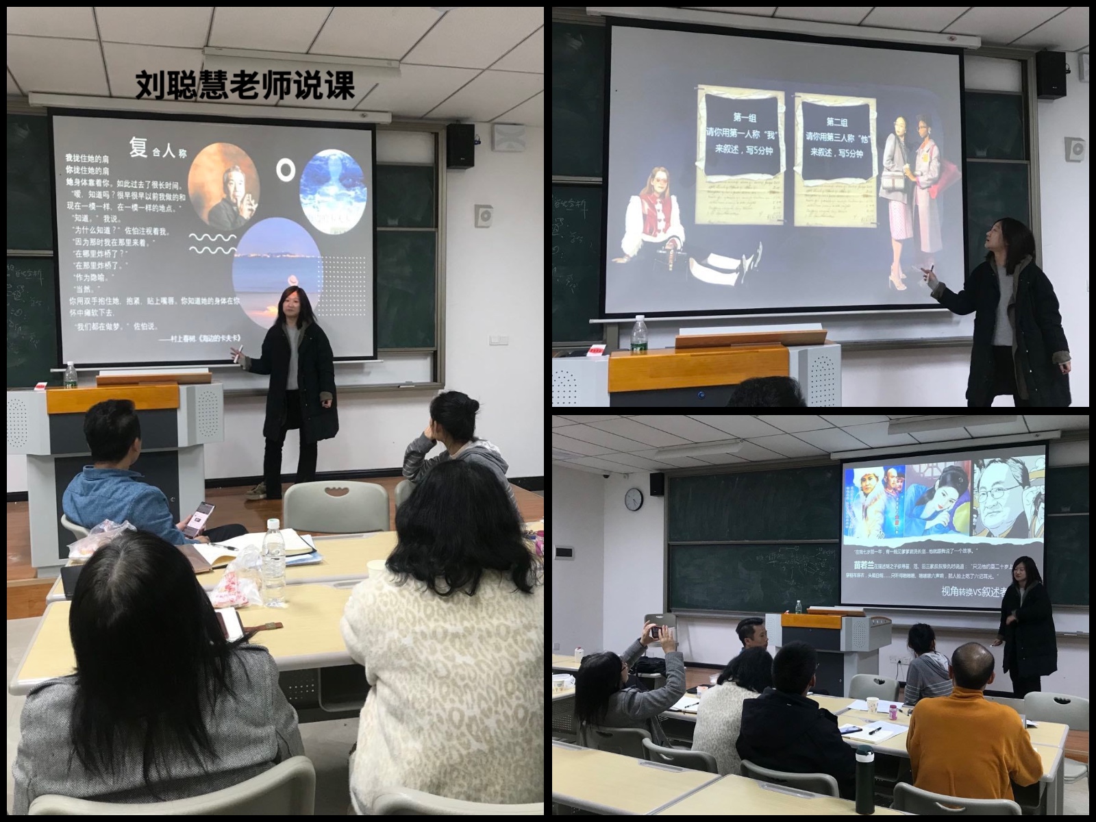“你曾与住在同一个小区的青梅竹马相恋多年,后因双方分手,你为此受了情伤,久久难以释怀……”刘聪慧老师以一则爱情故事的开头作为课堂练笔,把学生分为六组,按照不同的人称和视角行进来完成故事。在写作与讨论的过程中,让学生理解影响人称和视角选择的因素是由小说的主题决定。随后,刘老师以普希金《驿站长》、西西《虎地》、严歌苓《扶桑》、东野圭吾《嫌疑人X的献身》、村上春树《海边的卡夫卡》等为例,阐述了第一人称、第二人称、第三人称和复合人称的特点。
