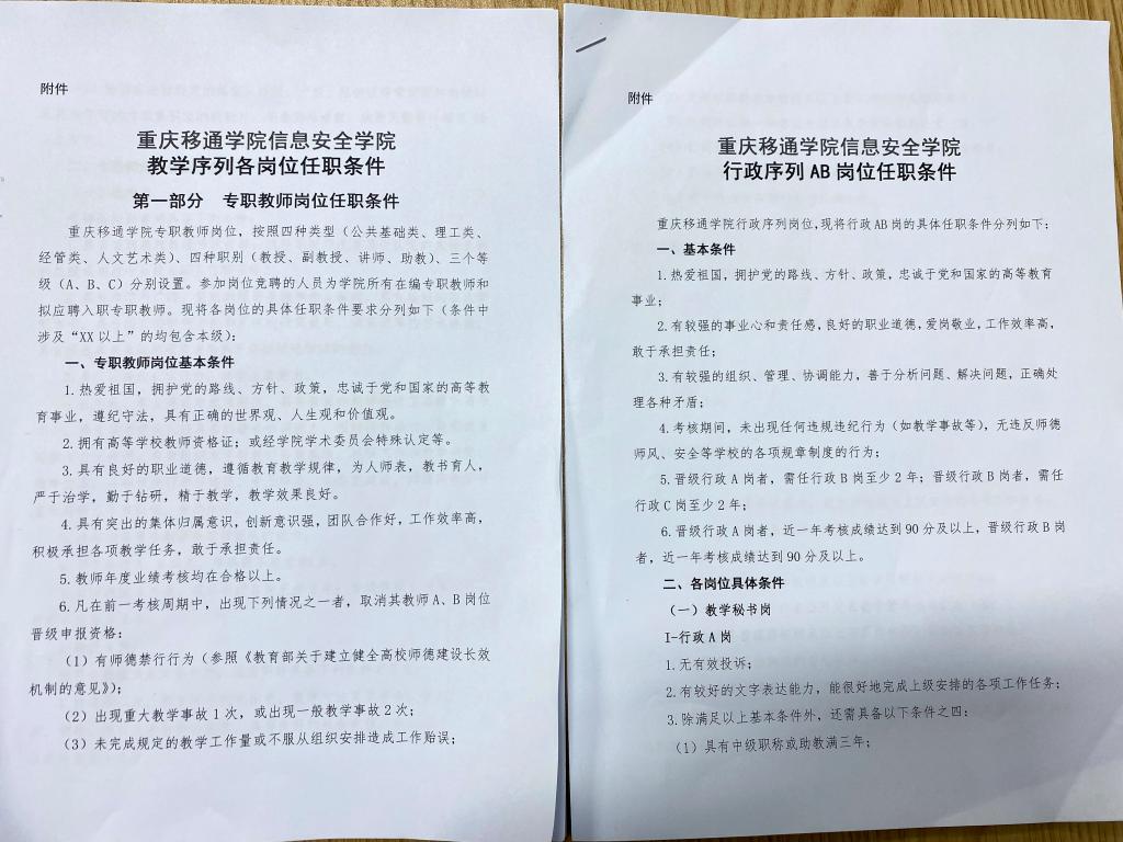 最后,学院全体教师针对《重庆移通学院本科教学工作合格评估资料汇编系列(二)—指标体系内涵解读及其他》中教师队伍要求和学校“四位一体+双院制”培养模式定位梳理了学院教师和行政序列ABC岗位任职条件,并进行论证修改,制定和完善了教师编制标准,得到了每个老师的认可。