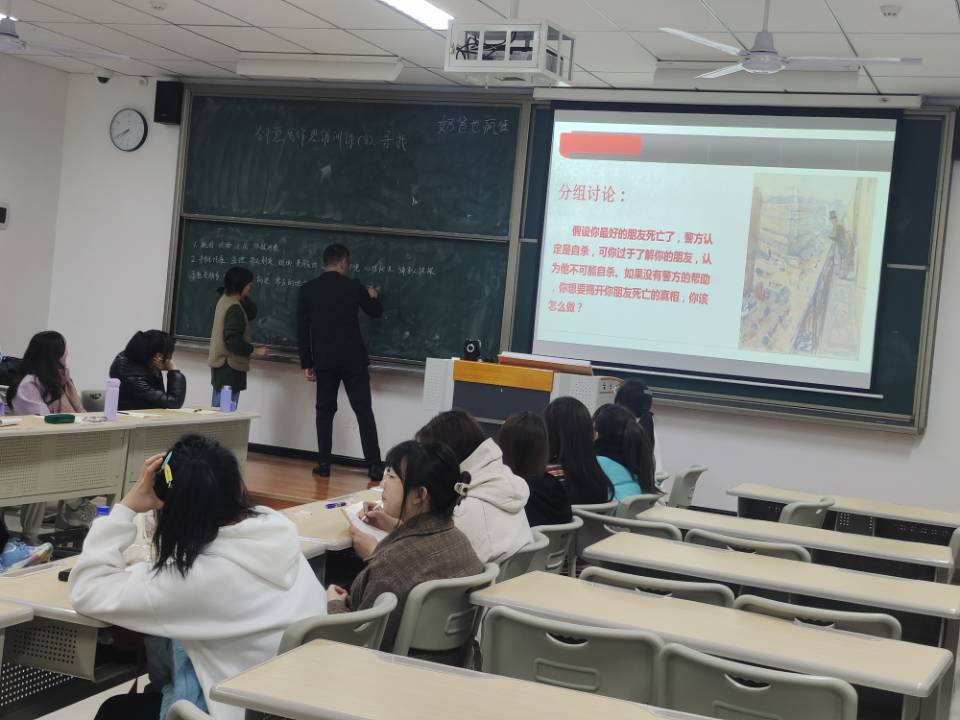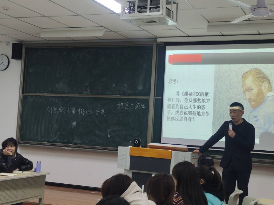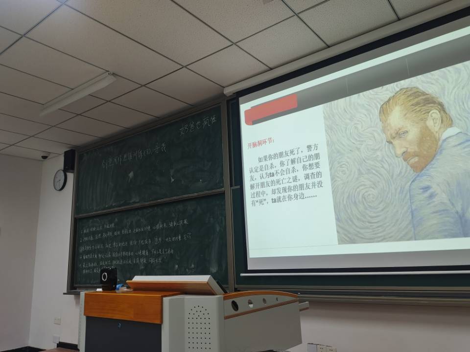 正式讲课前,张林老师给我们播放了《嫌疑犯X的献身》的电影解说视频,并让我们分组讨论,让我们思考从该电影的哪些地方能看到自己人生的影子,或者说从哪些地方促使我们反省自身。