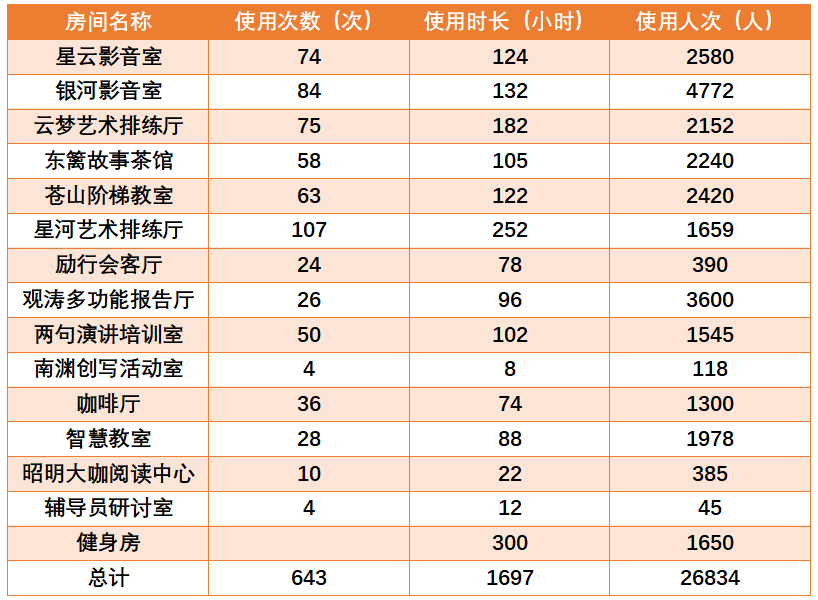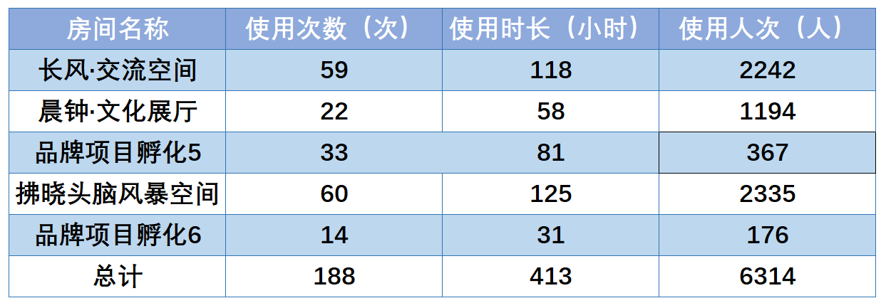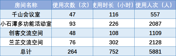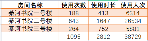自11月以来,綦河书院一、二、三号楼书院功能室总使用1095次,总使用时长2812小时,总使用人次为38729。綦河书院可共享空间平均每月使用1613人次,平均每天使用功能室约94小时,可共享空间每天每间使用功能室约4小时,平均每天使用约为1290人次。