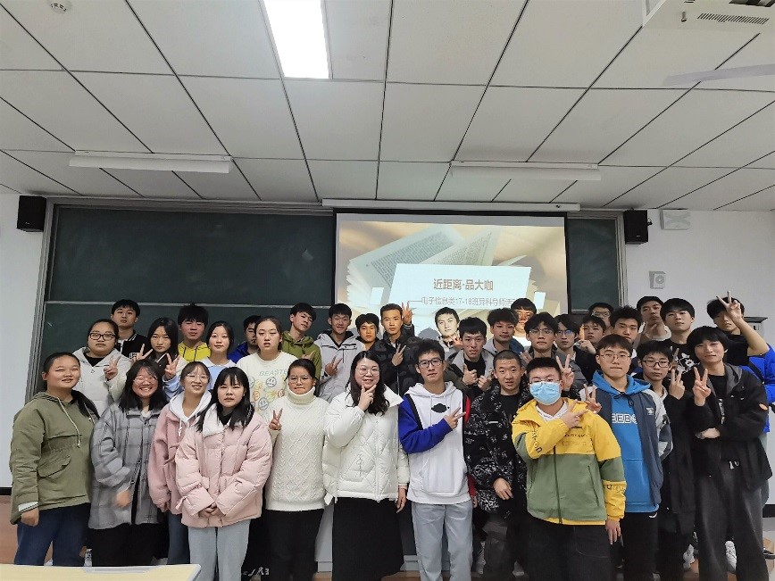 为进一步贯彻落实全生异科导师制工作要求,深入了解学生在学习和生活上的情况,通信与信息工程学院10名异科导师与同学们开展了形式不同、主题各异的交流活动。“大咖阅读”作为异科导师工作的一个重要部分,也是导师们开展活动的重要抓手。近日,黄新燕老师与电子信息类17-18班全体同学开展了一场主题为“近距离,品大咖”的活动。活动上,黄老师向同学们分享了自己阅读大咖书籍的感受,希望同学们在这个碎片化的时代精选值得我们花时间的事和人,将值得的事情做到极致,对我们爱的人付出最真的情感,给予这些人和事最多的时间和资源。