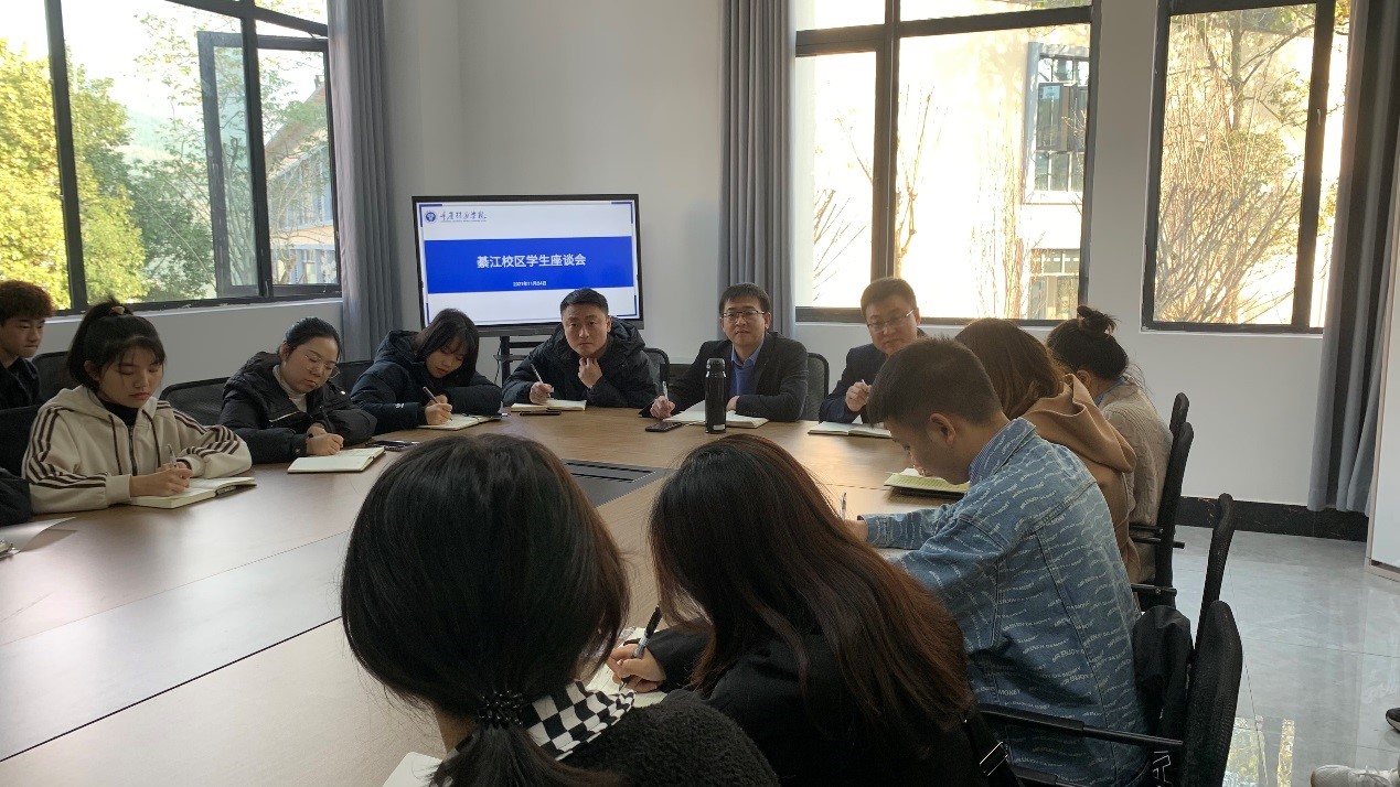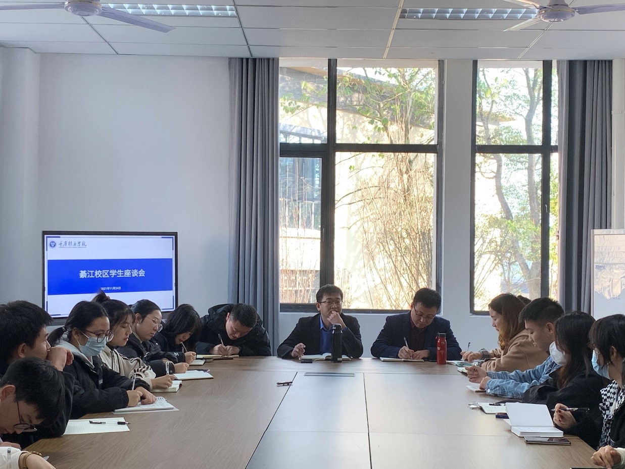 2021年11月24日,綦江校区学生座谈会在勇者楼101会议室举行,来自4个学院的32名学生参加了会议,李文豹副校长、学生处、校团委、书院部、艺术教育中心等部门负责人出席会议并于学生进行交流。