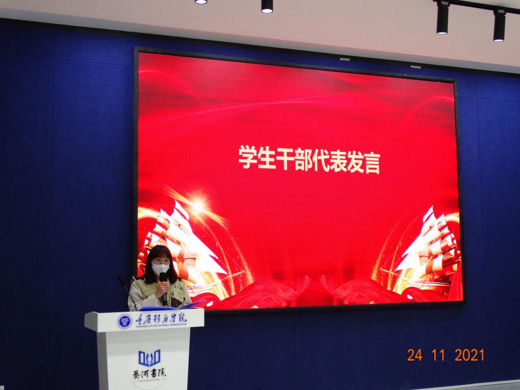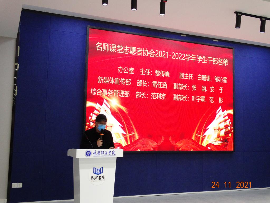 刘方旺老师宣读《重庆移通学院名师课堂志愿者协会2021-2022学年学生干部名单》,并表达了对新任干部的殷切期望。号召协会全体成员在干部的带领下互相扶持、彼此配合、共同成长。