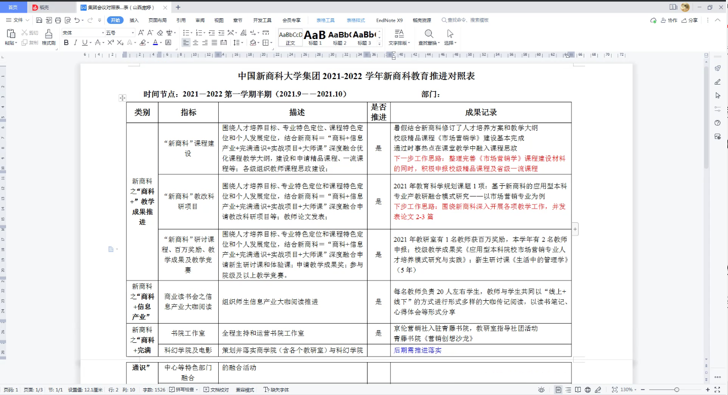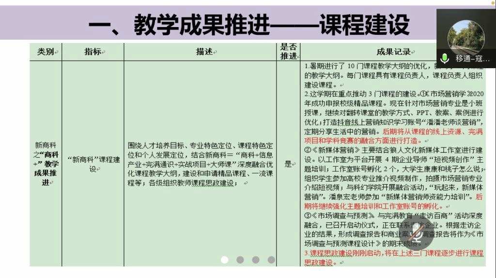 首先,重庆移通学院市场营销教研室主任寇小玲老师汇报新商科教育推进情况。寇老师主要汇报了三个要点:一是这学期主要推进3门课程的建设;二是《市场营销学》在2020年成功申请到了校级精品课程,现针对市场营销专业的学生继续沿用翻转课堂的教学方式;三是用学生们喜爱的方式,最新打造了“潘潘老师谈营销”的账号在抖音上普及营销知识。然后,针对下一步的工作推进制定了实施计划。