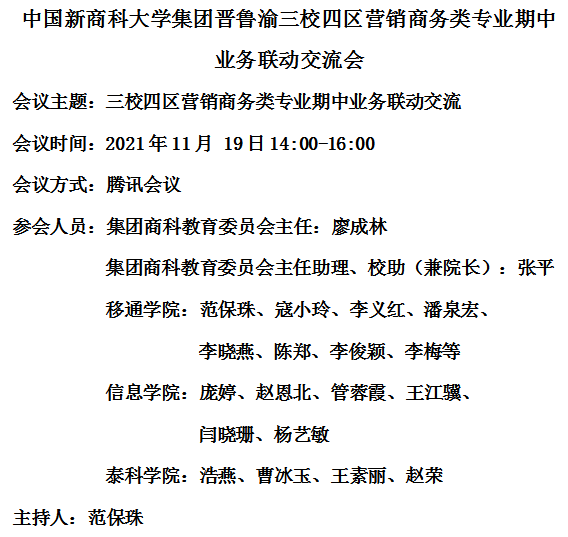 11月19日下午14:00,重庆移通学院、晋中信息学院以及山东泰科学院三校四区通过腾讯会议召开了以“营销商务类专业期中业务联动”为主题的交流与研讨会。会议邀请了集团商科教育委员会主任廖成林教授、集团商科教育委员会主任助理张平,参会人员有重庆移通学院合川校区、綦江校区淬炼·国际商学院、晋中信息学院淬炼·国际商学院、山东泰科学院淬炼·国际商学院的副院长、教研室主任、骨干教师以及新教师代表。本次会议由范保珠副院长主持。