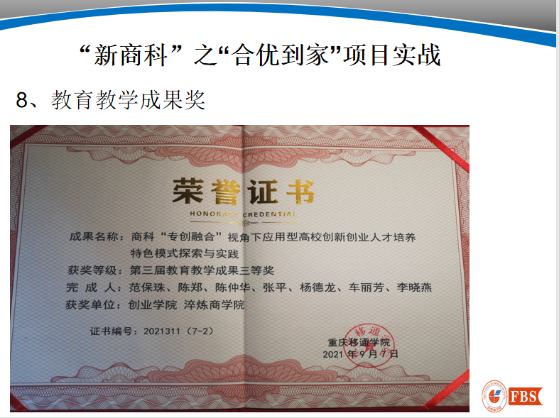 重庆移通学院范保珠老师分享了企业项目实战的经验。在2020-2021这两年做商科课程融合建设的过程中,结合校企合作单位合优网的合优到家项目实战及相关领域前沿,即“商科课程《网络营销》+”实战项目,相继“+”商业案例、各类大赛、新生研讨课、教改科研、注册公司创业、挂职锻炼等,取得了一系列成果。