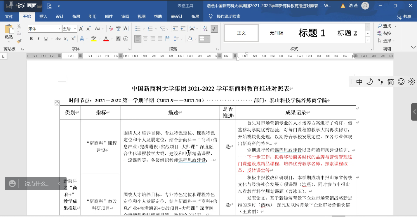 接着,晋中信息学院市场营销教研室主任庞婷老师汇报新商科教育推进情况。庞老师提到,《市场营销学》校级精品课程建设基本完成,并通过时事热点在课堂教学中融入课程思政。然后庞老师对目前的工作做了总结,并对下一步的工作推进制定了实施计划。