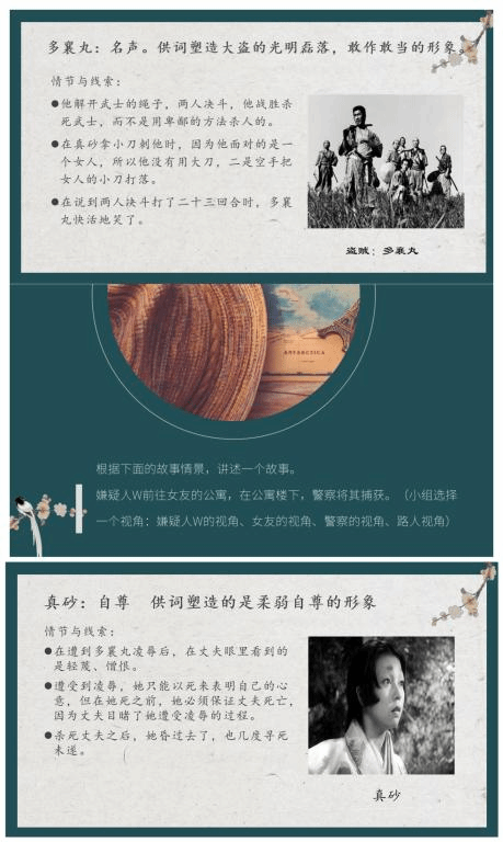 周五晚的这堂多视角写作作品《创意阅读》课,伴着这口可爱的乡音,我们走进了芥川龙之介的《竹林中》的世界。整个案件是一个叙事的迷宫,全篇七段文字有七个视角,我们师生一同站在四个案件证人以及关键人物大盗多襄丸,被害者妻子真砂、被害者借巫女之口的多个视角,深刻剖析了这一作品的成因。
