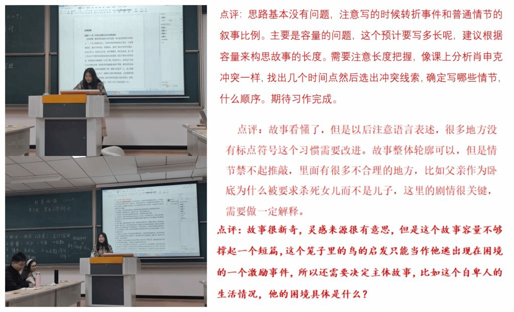 而写作研讨更是能直接发现问题的一节课,李老师指出我们在格式、情节、容量、线索等方面的问题,直击要害。李老师说我们大致可以分为强叙事型和强描写型,我发现我是倾向于强叙事的,但是我的逻辑性差,线索与线索之间关联性弱。李老师便给我建议:“注意写的时候转折事件和普通情节的叙事比例。还有容量的问题,这个预计要写多长呢,建议根据容量来构思故事的长度。另外可以像课上分析《肖申克的救赎》里的冲突一样,找出几个时间点然后选出冲突线索,确定写哪些情节,什么顺序。”