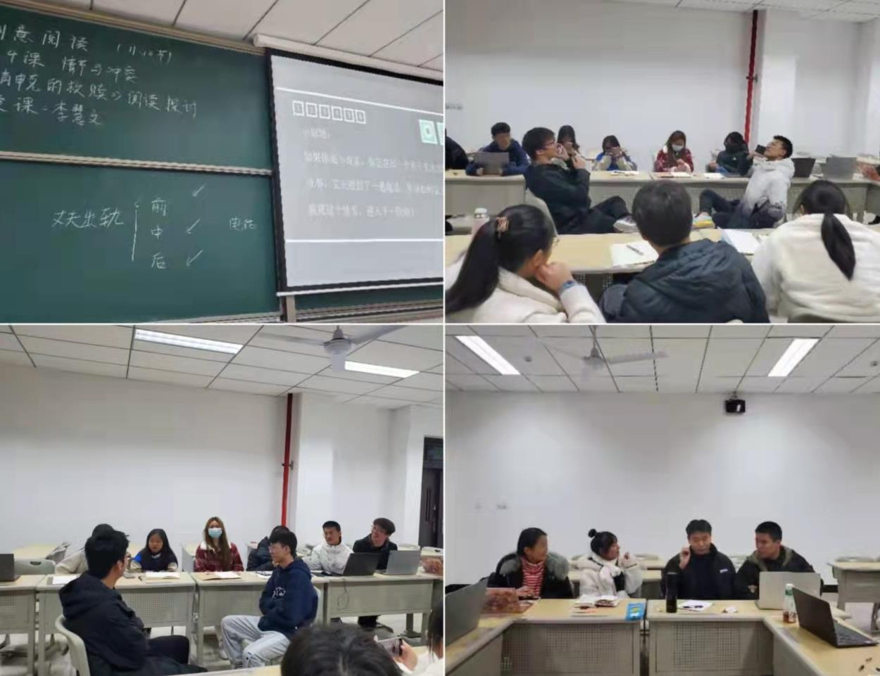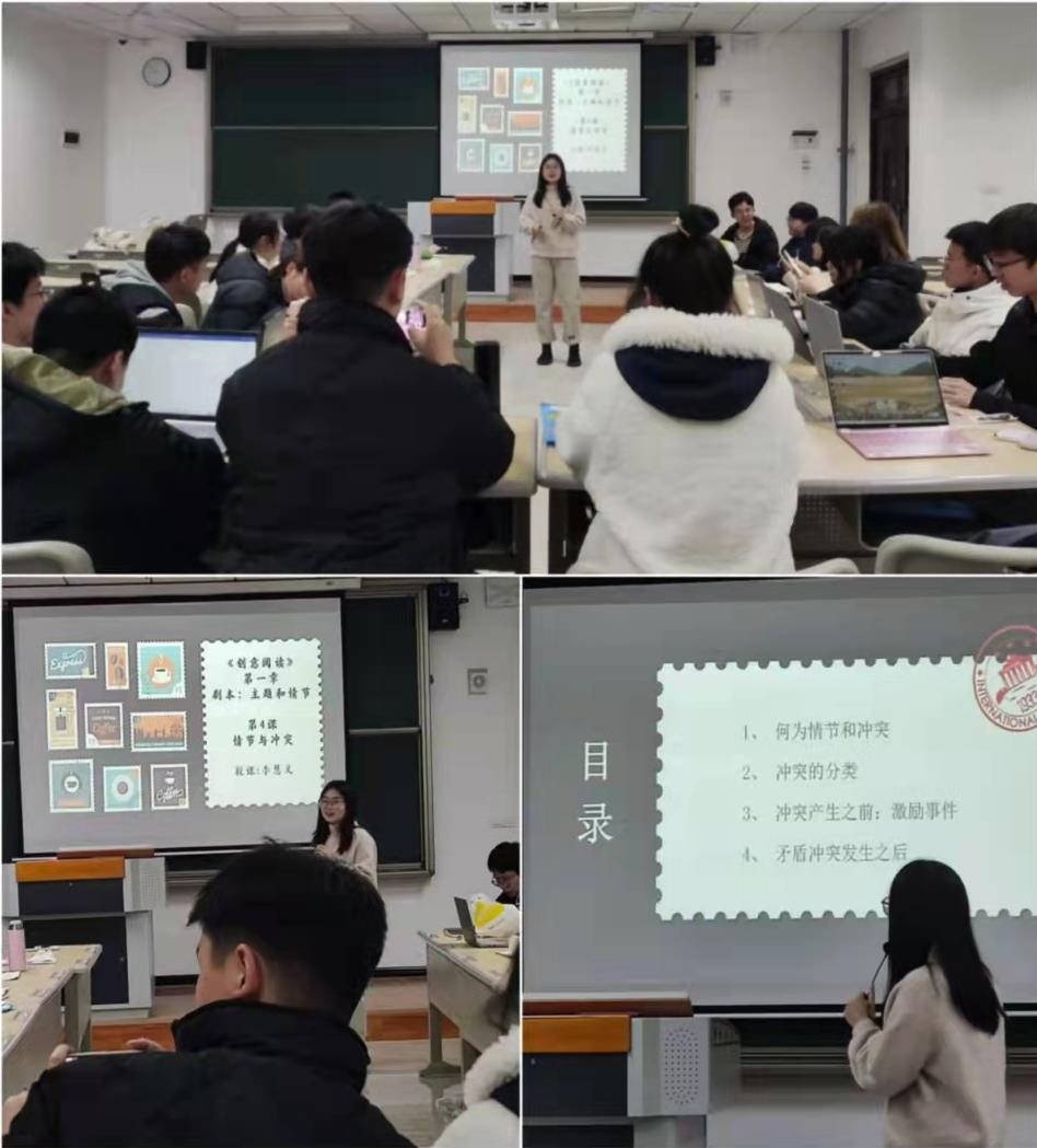 当课堂小剧场那一张PPT出现在屏幕上时,每个人的心都开始激动起来。如果你是小说家,你正在写一个关于丈夫出轨的故事,丈夫接到了一通电话,你该如何让主人公脱离这个情节,进入下一环节?我们在课堂上无拘无束,畅所欲言,尽情发挥,一段时间的讨论后,同学们以小组为单位开始了剧情表演,作为表演者之一的我,根据李老师在课上所讲述的方法结合组内讨论出的创意,我(丈夫)与我的搭档(小三)上演了一出妻子逮住了“小三”,逼迫她按照平时联系“我”的方式与我通话,妻子则在“小三”旁边录音获取我出轨证据的故事,表演过程欢笑不断,同学与老师其乐融融!