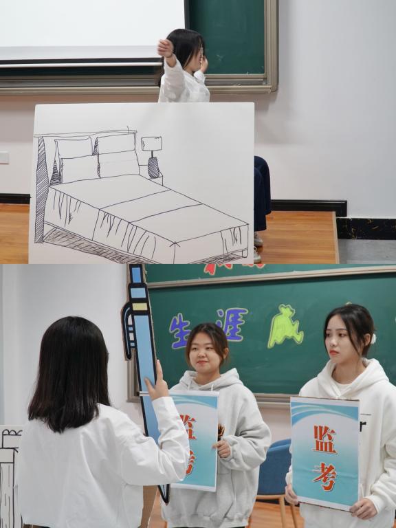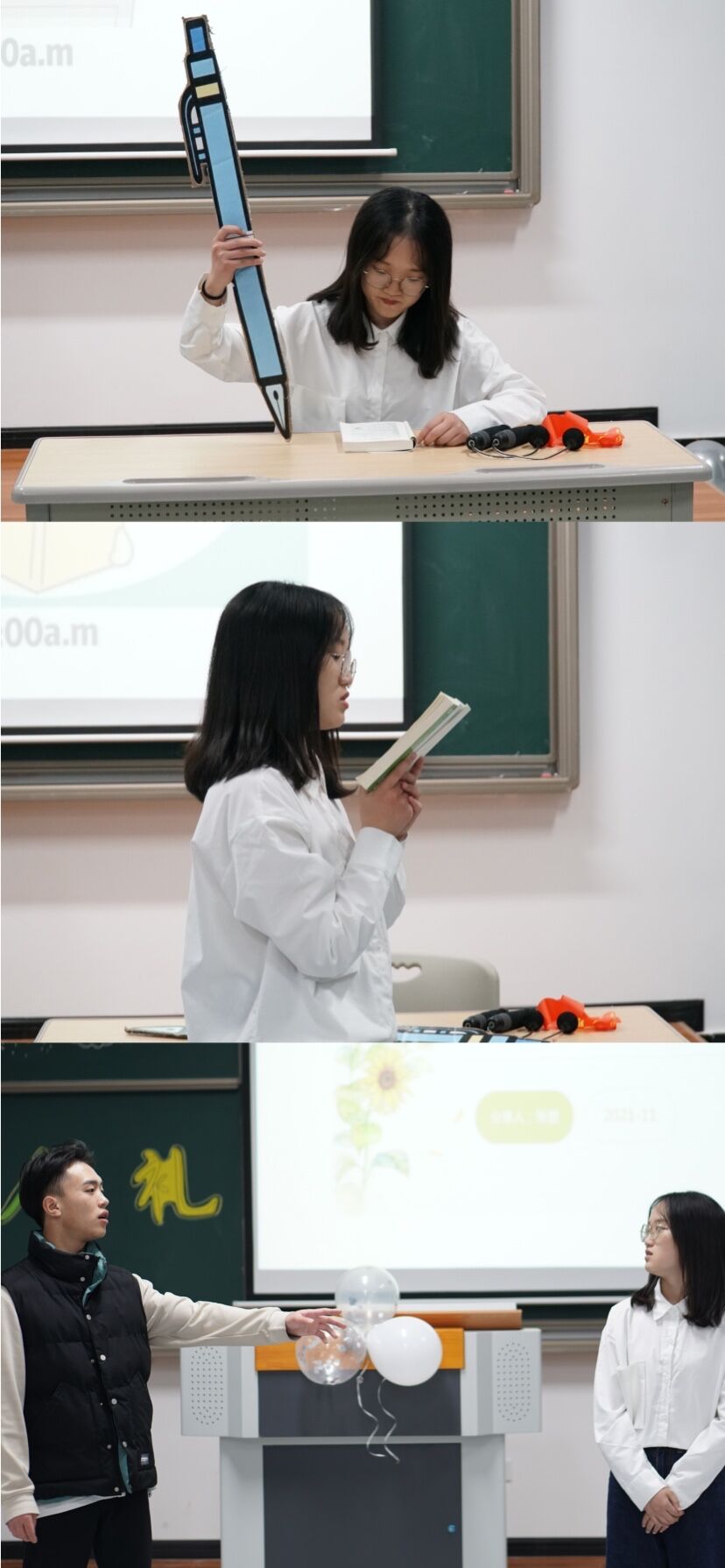 近日抖音上一对父女火了起来,女孩上学总是磨蹭,爸爸一脸无奈,女儿却无动于衷。此次年级会,非常有幸请到“父女俩”来到现场,由段亚、王鑫明同学上演的情景剧正式拉开了年级会的序幕,在场同学们通过演绎看见自己小时候拖拉的模样。如何在大学里成为更好的自己,怎样找到大学中的优秀榜样,令同学们深深沉思。
