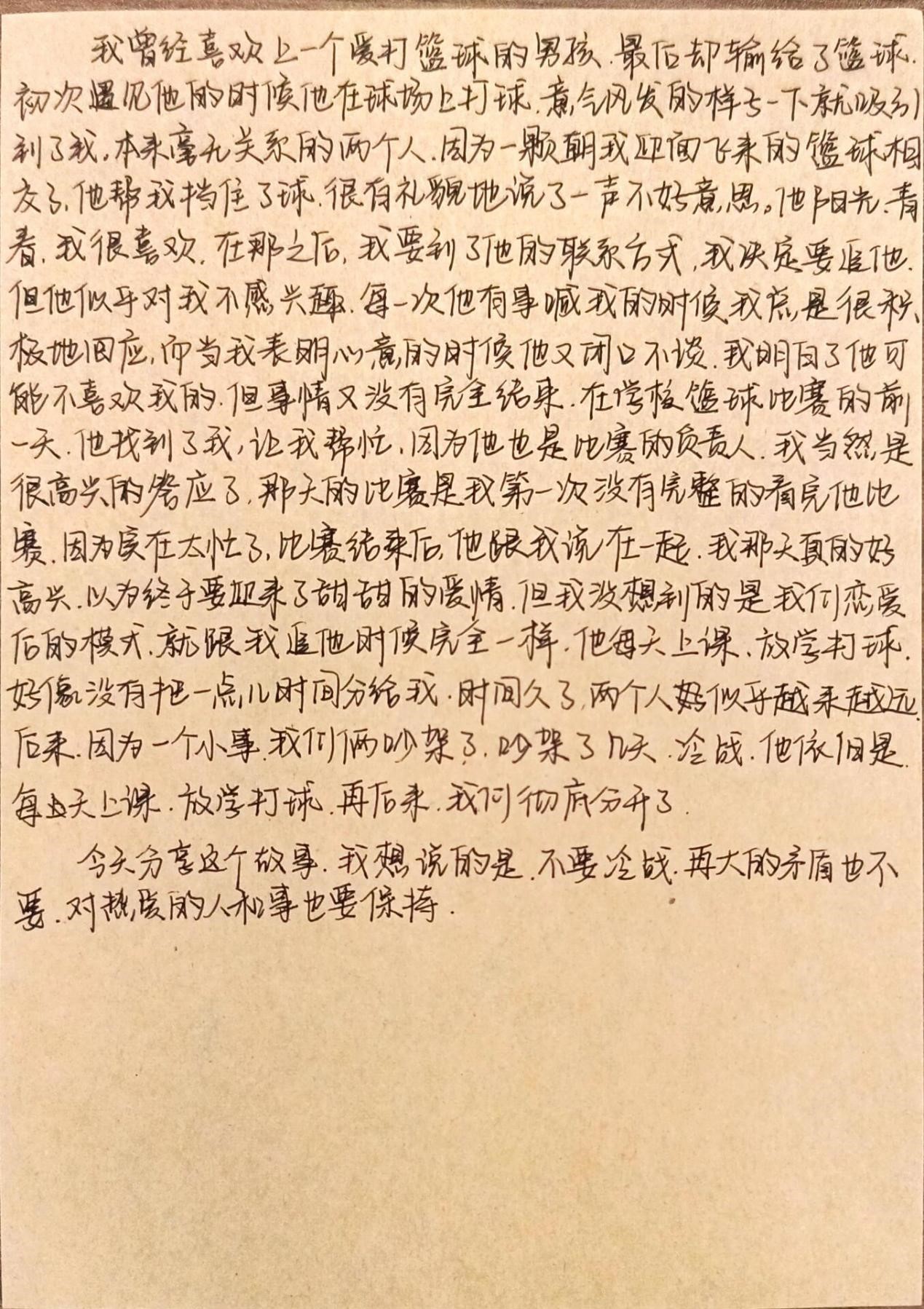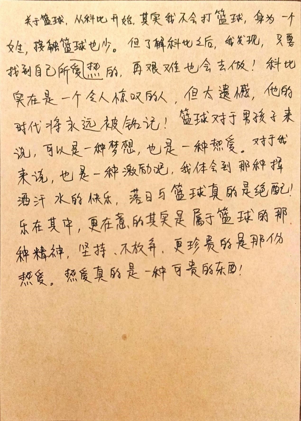 上了高中之后,因为体育课选报要选具体的运动项目,我选择了篮球,也因此有幸碰见了高中生涯最好的朋友,每次上课的时候,男生都是打对抗、打小比赛什么的,我俩女生只有“相依为命”,在旁边学如何投篮,结课考试的时候男生测半场上篮,我俩只有测投篮个数。在平日,我们空闲时间也会一起打打球锻炼和交流,也会去看比赛,为喜欢的人、喜欢的球队加油。到了高三的时候,学业开始紧张,只能趁着空闲时间看学弟学妹们的班级篮球赛,记得当时就看到有位学弟三分球特别准,我就经常去看他们班的比赛,一来二去便跟他有了交流,也成为了好朋友,现在到了大学,我想我同样会因为篮球而遇到更多的朋友。