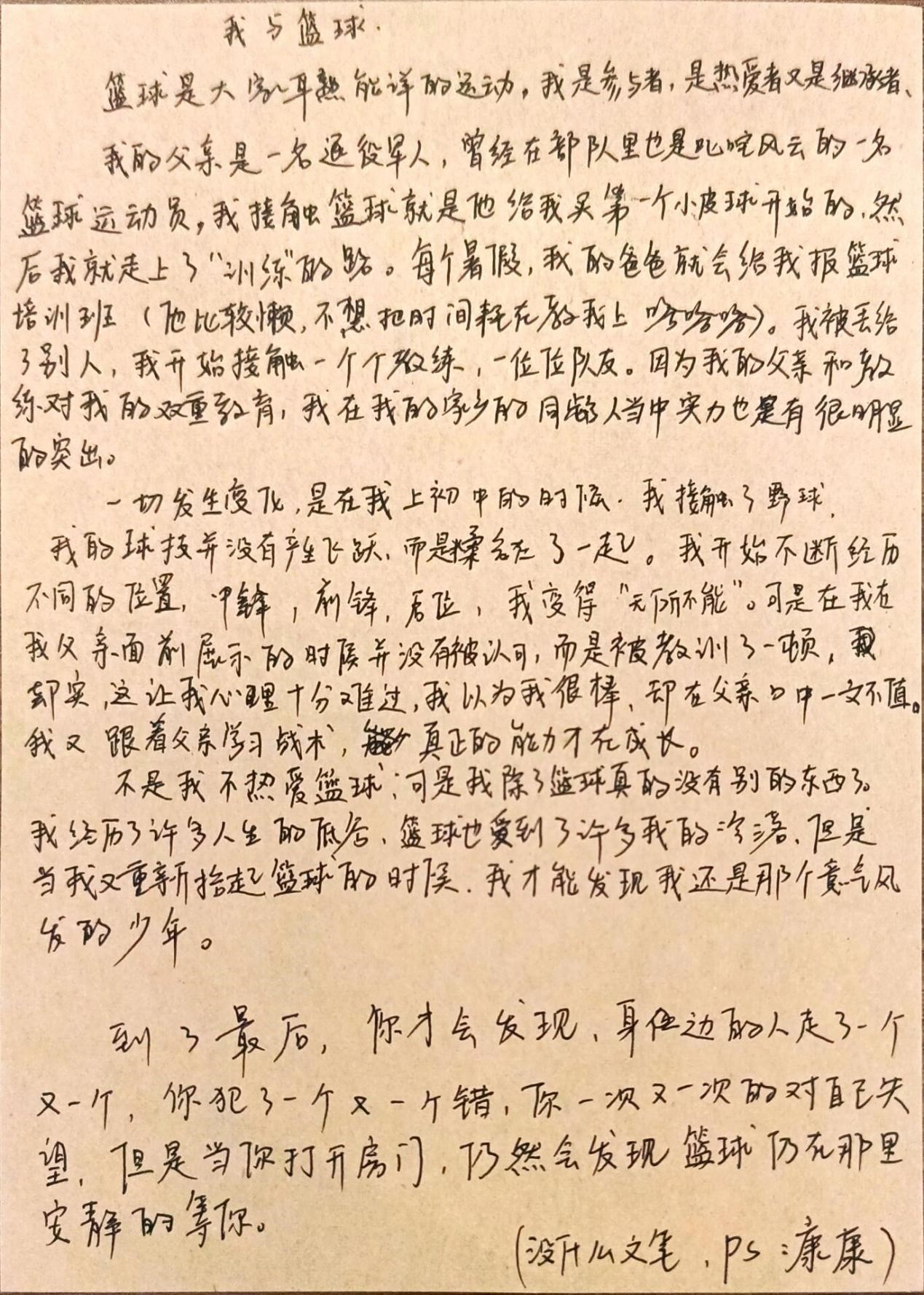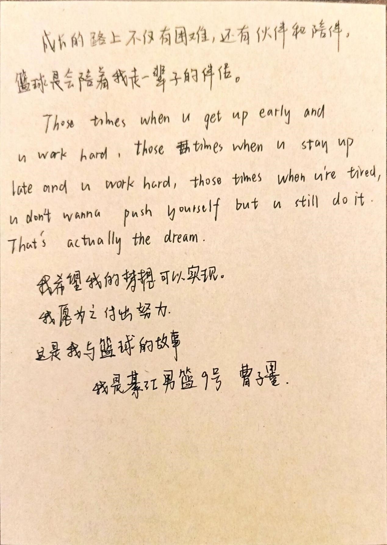 我享受着为了破坏对手的进攻而拼命防守的勇敢、我享受着为帮助队友解围而尽全力协防成功的激动,同样,我也享受着一次次摔倒后又被队友伸手拉一把的鼓舞。如果要问我,篮球给我带来了什么,我会回答“篮球给我带来了梦想,带来了我对未来无限的遐想,你可以不够强大,但是你不能没有梦想,练球很累,但不苦,故事很长,我们可以先打完这场球,再谈理想。”